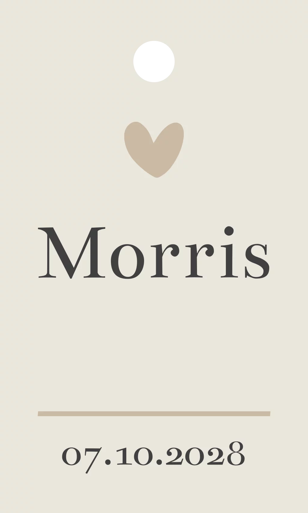Helemaal in stijl met het geboortekaartje is dit labeltje gemaakt in de kleur beige met het kleine hartje boven de naam. Zo kan je het bedankje helemaal laten matchen met het geboortekaartje.