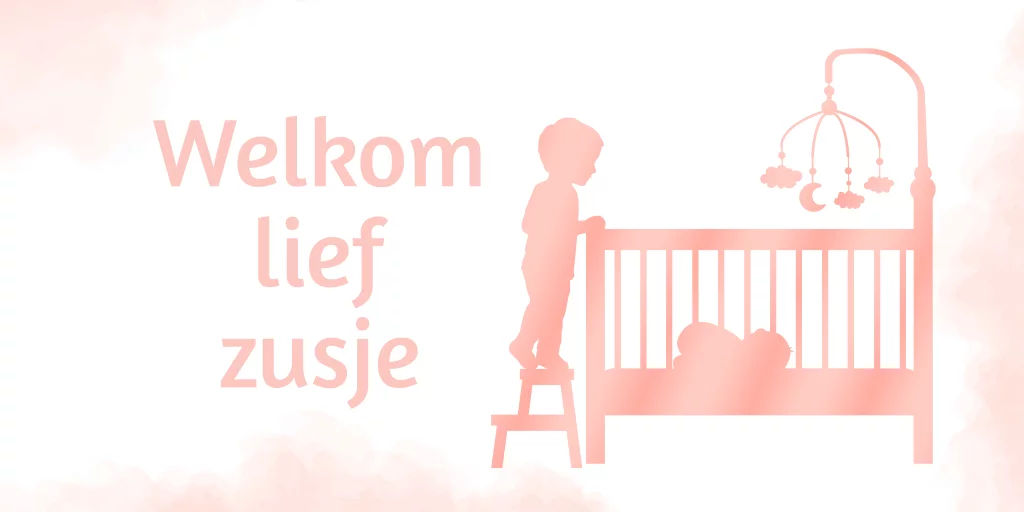 Verwelkom jullie dochter en zusje met dit lieve labeltje voor aan de doopsuiker. De kaart is volledig in roze stijl met zacht roze waterverf en een silhouet van een grote broer met een baby in de wieg.