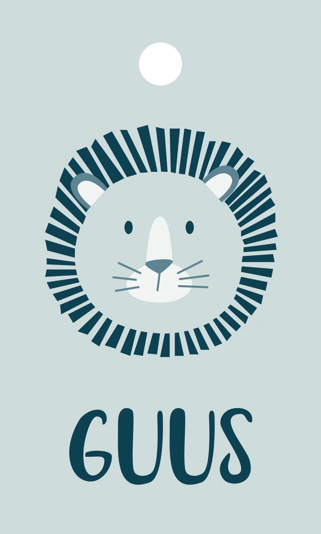 Geef de doopsuiker een persoonlijke touch met een label in dezelfde stijl als het geboortekaartje en met de naam van de baby erop. Op dit labeltje staat een leeuw in cartoon stijl in groen blauwe kleuren.