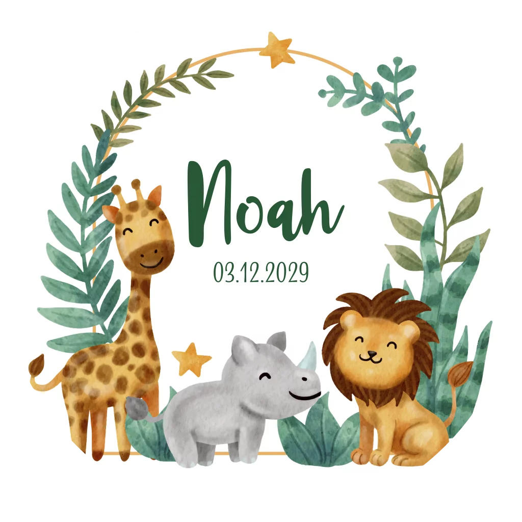 Versier of sluit je doopsuiker doosje of zakje met dit bijpassende stickertje met naam en geboortedatum omringd door tropische bladeren en jungle dieren, een giraf, olifant en leeuw.