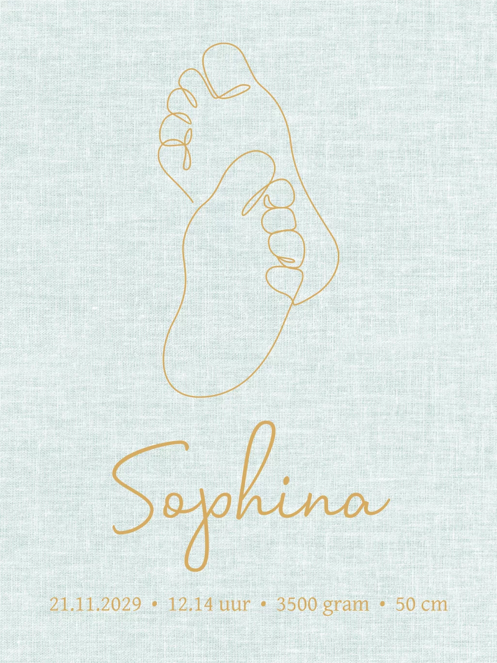 Op zoek naar een stijlvolle maar lieve poster? Waar ook de geboortegegevens op staan van jouw kleintje? Dan is dit de poster voor jou! De achtergrond is gevuld met een linnen structuur afbeelding in een zacht groene kleur met daarop een lijntekening in goud kleur van twee baby voetjes. Onder de voetjes is er plek voor de voornaam en alle geboortegegevens.