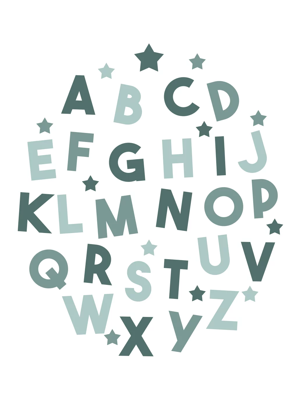 Op zoek naar een speelse decoratie poster voor de babykamer? Ontdek onze poster met een uniek alfabet in drie verschillende groentinten met sterren tussen de letters door. De kleuren van de poster kan je in de editor helemaal naar wens aanpassen, ook het lettertype is aanpasbaar. Deze poster is perfect te combineren met twee andere posters om zo een prachtig drieluik te vormen. Ook leuk om cadeau te doen!