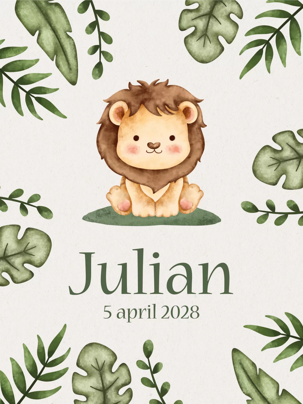 Een beige poster met een lief leeuwtje in het midden. Aan de randen van de poster zijn verschillende groene blaadjes te zien. Onder het leeuwtje staat de voorbeeldnaam Julian en de geboortedatum. Heb je het bijpassende geboortekaartje besteld? Dan is dit wel een heel leuk idee om het geboortekaartje terug te laten komen in de babykamer.