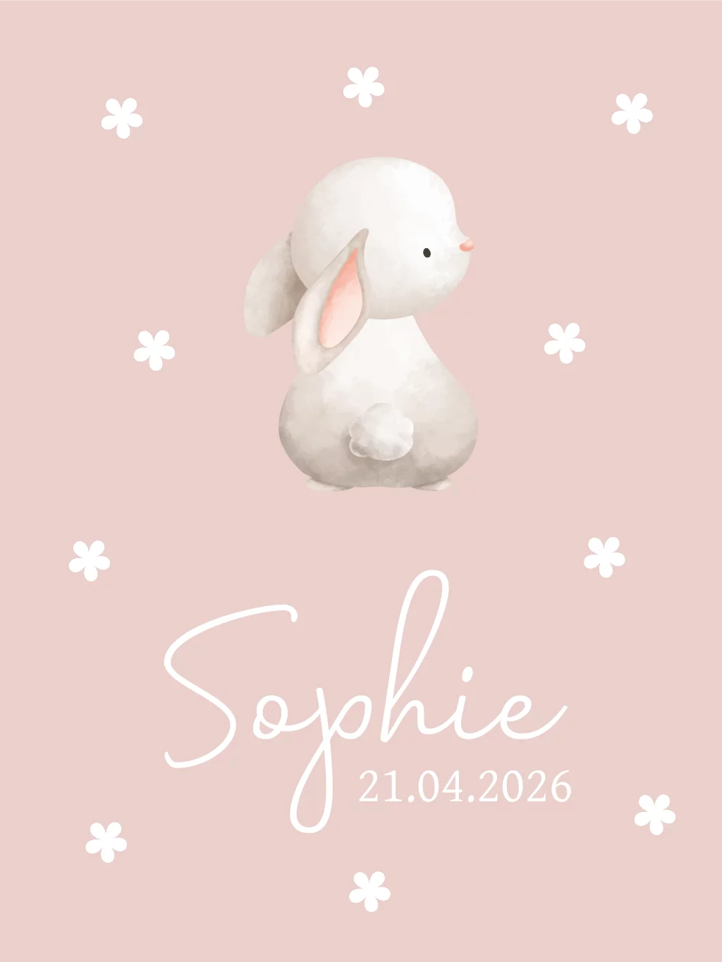 Het lieve konijntje van het geboortekaartje kan je zo ook terug laten komen in de babykamer met deze lieve poster. Met de naam van jullie kleintje maak je de poster helemaal eigen.