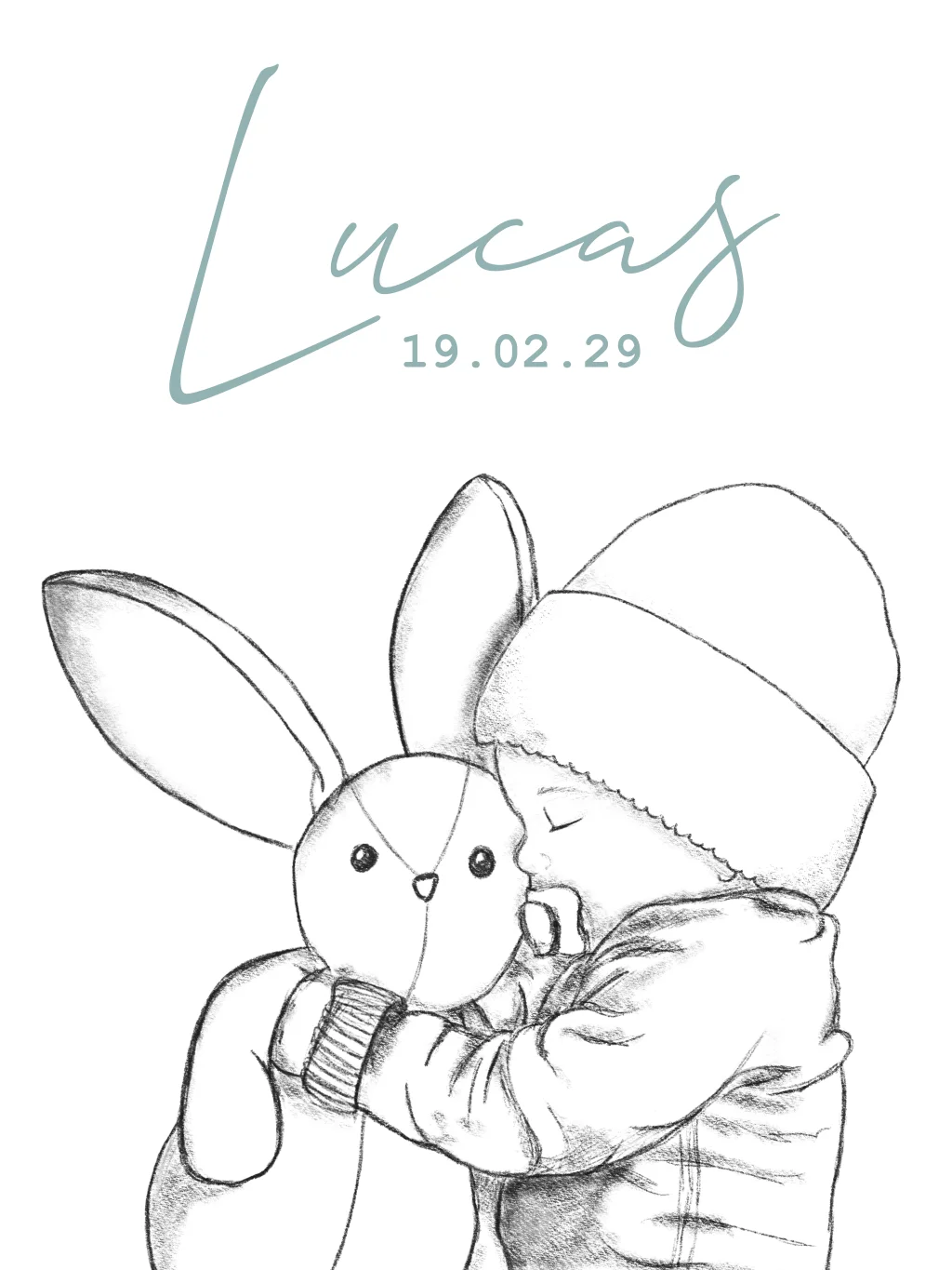 Poster van een baby knuffelend met een knuffel konijn in getekende stijl. Passend bij de geboorte van een jongen en een meisje. Leuk voor in de babykamer aan de muur of als poster op het raam.