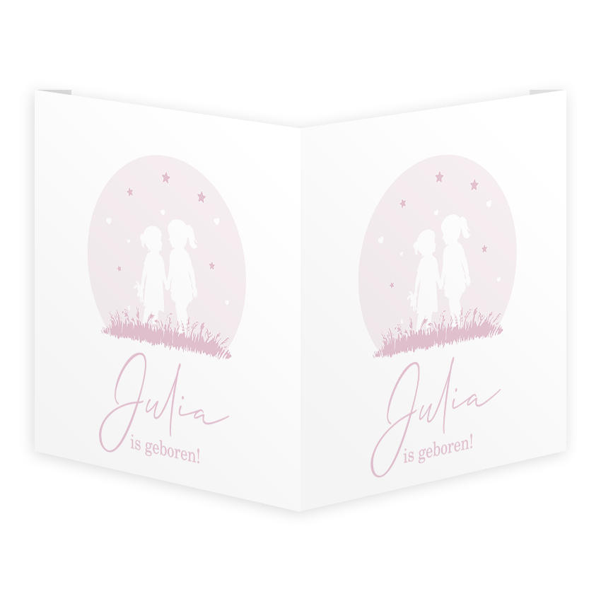 Kondig de geboorte van jullie dochter en zusje met dit lieve zacht roze raambord. Op het raambord staan twee meisjes hand in hand in een licht roze cirkel met hartjes en sterren om hun heen in het gras. Daaronder is plek voor de naam van de baby.