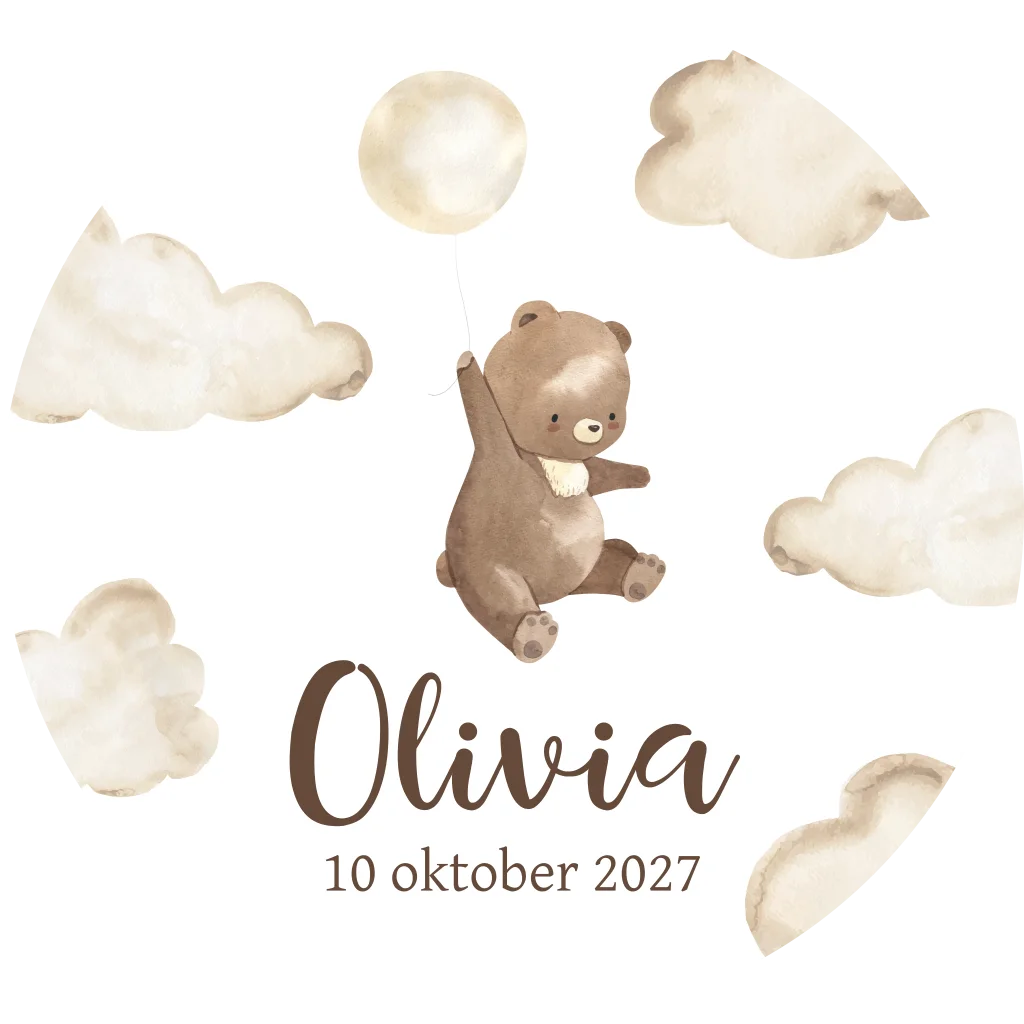 Een mooie raamsticker om de geboorte van jouw kleintje mee aan te kondigen. In het midden zie je een beertje hangend aan een ballon tussen beige gekleurde wolken. Een mooie neutrale raamsticker die voor de geboorte van een jongen of meisje geschikt is.