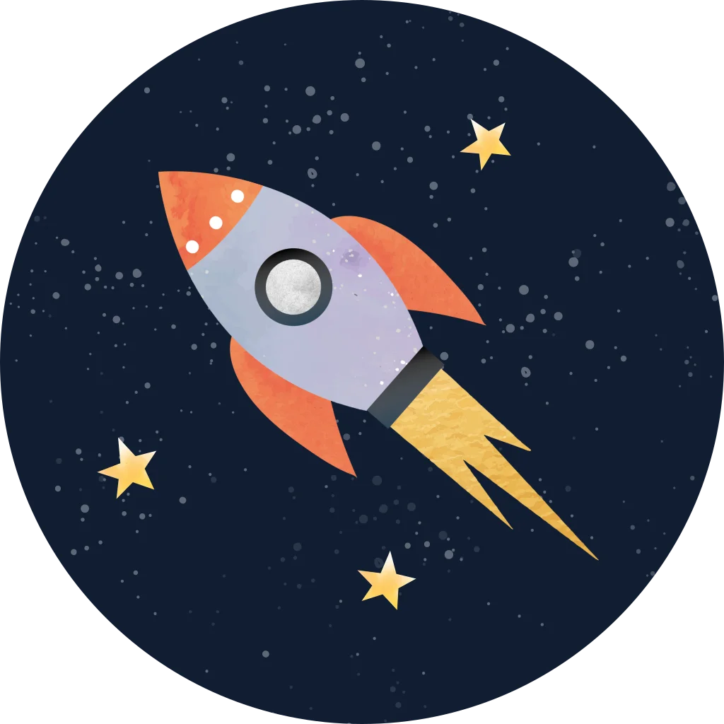 Een donkerblauwe sluitzegel met in het midden een raket met daaromheen gele sterren.