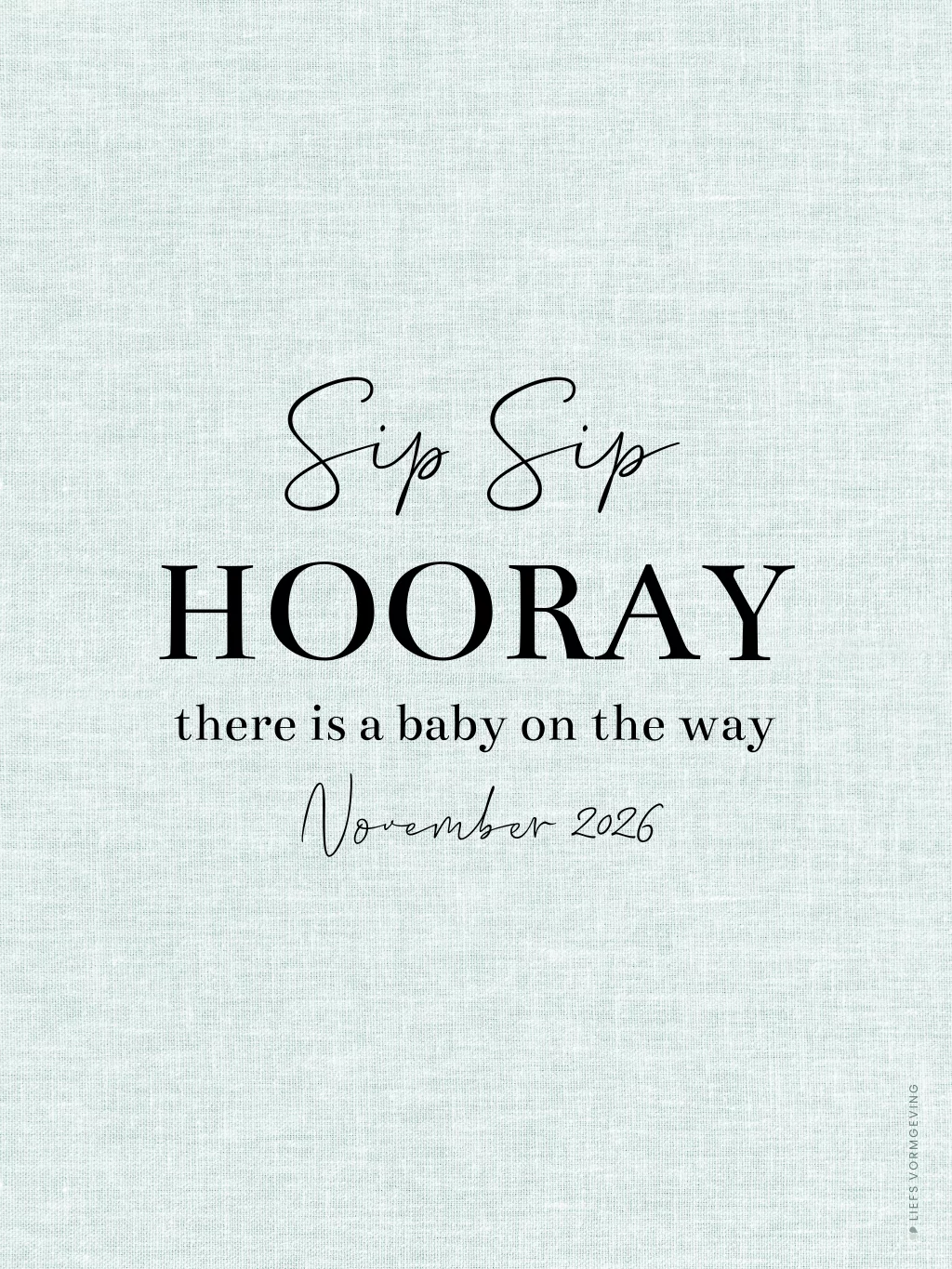Hip ontwerp met een typografische zwarte tekst op een groene linnen achtergrond. Sip Sip Hooray, there is a baby on the way. Maak het etiket persoonlijk met de datum en jaartal van de uitgerekende datum.