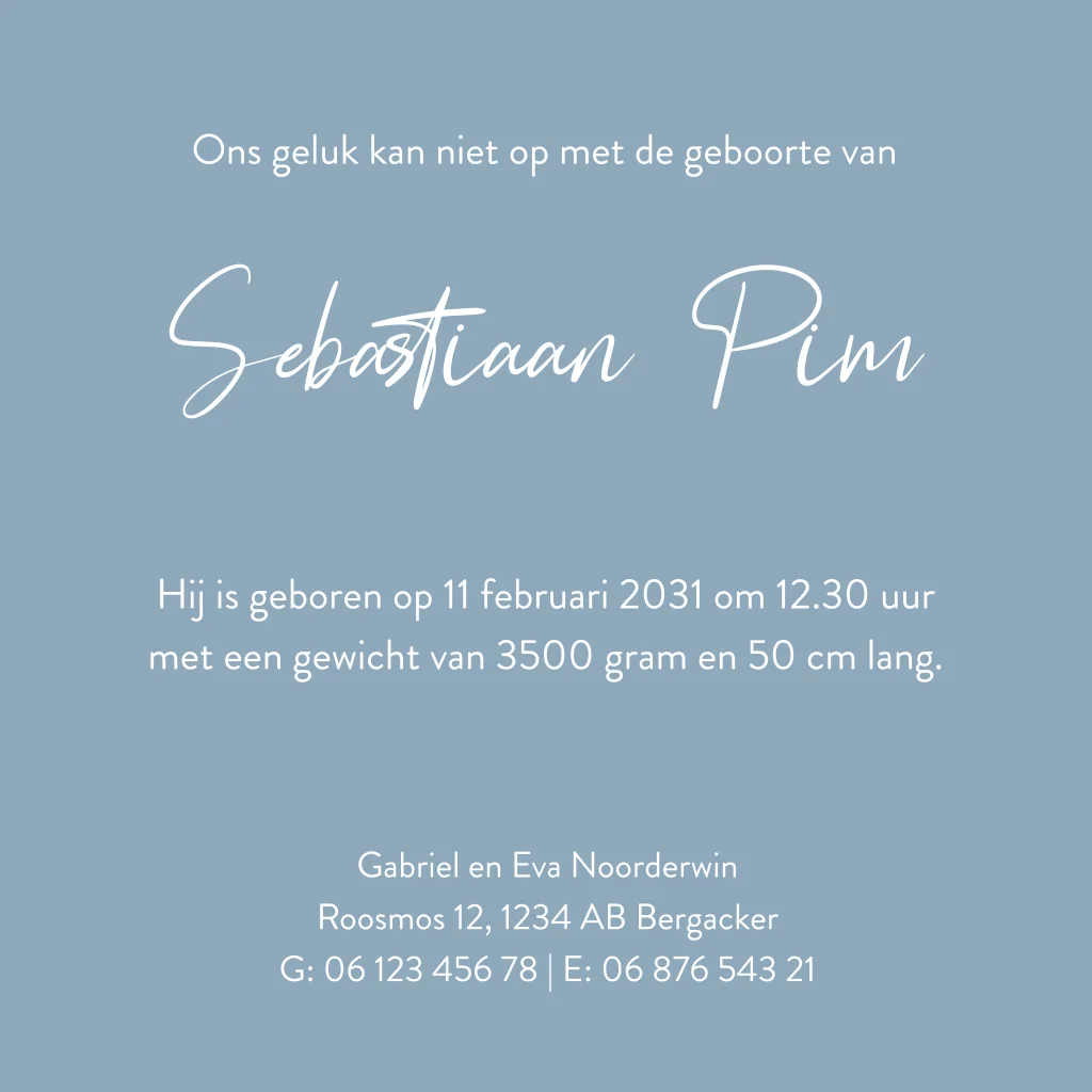 Een volledig blauw geboortekaartje met witte tekst. Op de voorkant is er boven de naam plek voor een plakstrikje. De plakstrikjes zijn apart te bestellen en in verschillende kleuren beschikbaar.