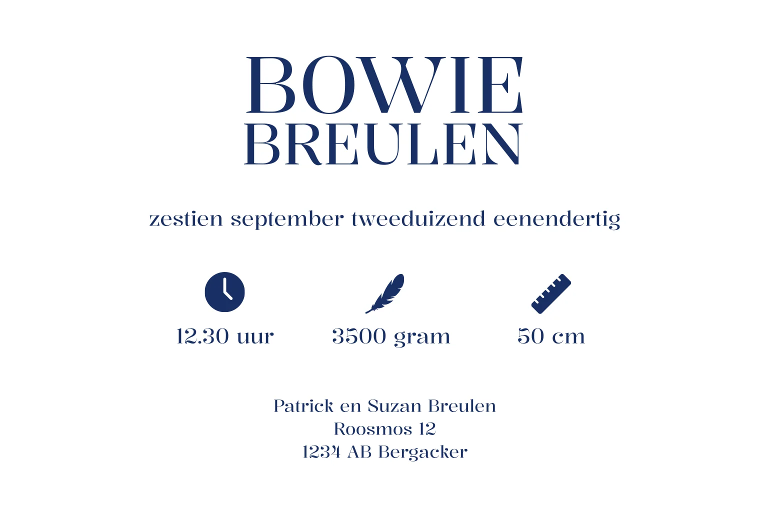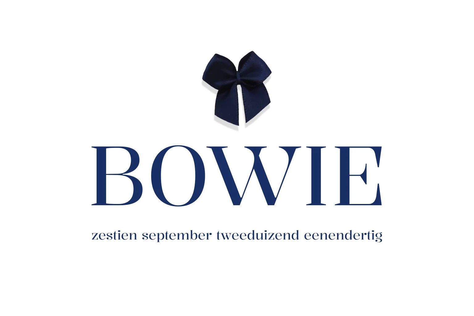 Dit is een minimalistisch geboortekaartje met chique opmaak in donkerblauwe kleur met ruimte voor een donkerblauwe strik. Aan de binnenkant is er ruimte voor een foto in de vorm van een hartje. In de editor kan je de opmaak volledig naar wens aanpassen. Apart kan je de strikjes bestellen, deze zijn in verschillende kleuren te bestellen.
