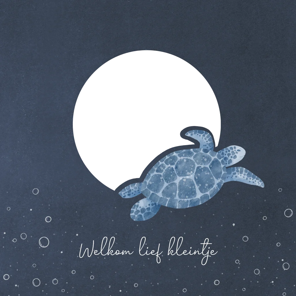 Donkerblauw geboortekaartje met schildpad en doorkijkvenster