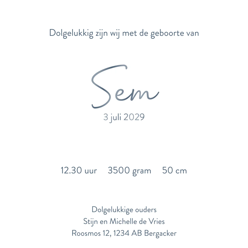 Een schattig geboortekaartje met blauwe schildpad op een donker blauwe achtergrond met een licht structuurtje erin. Op de kaart staat een strook met witte stipjes en luchtbellen afgebeeld waar ook plek is voor een klein stukje tekst. Door het venster kan je kijken naar de rechter binnenzijde waar de naam en geboortedatum staat afgedrukt in hoogglans blauw. De kaart is volledig naar wens aan te passen in de editor, zo past het perfect bij de geboorte van jouw kleintje.