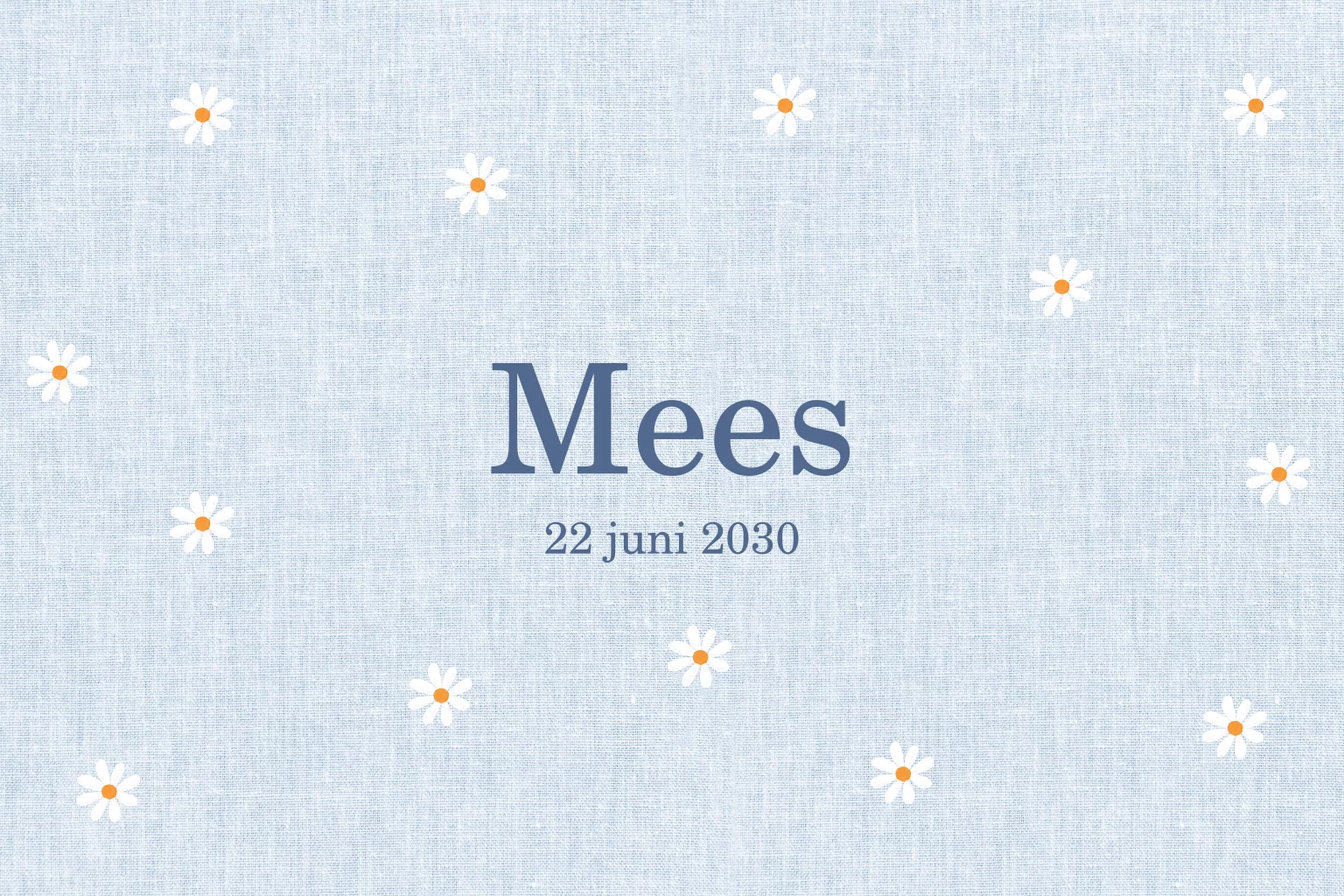 Een blauw enkel geboortekaartje met speelse madeliefjes op de voorkant. Op de achterkant staan de geboortegegevens uitgebeeld met een icoon.