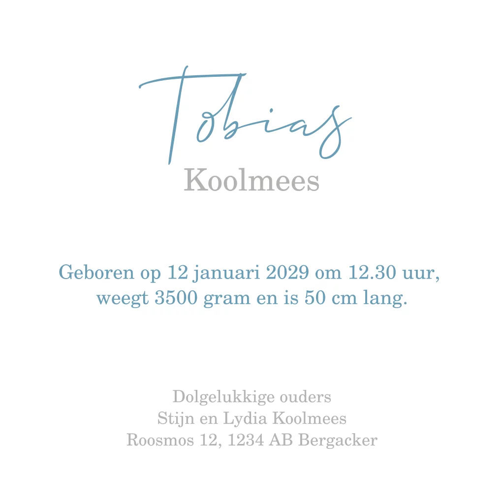 Dit typografisch opgemaakte kaartje is perfect voor ouders die op zoek zijn naar een clean en stijlvol ontwerp. De voorletter van jullie kindje wordt prominent weergegeven in het wit, met daaroverheen de naam in glanzende folie. De achtergrond heeft een subtiel verloopje in de kleur blauw. Dit zorgt voor een elegant en tijdloos effect.