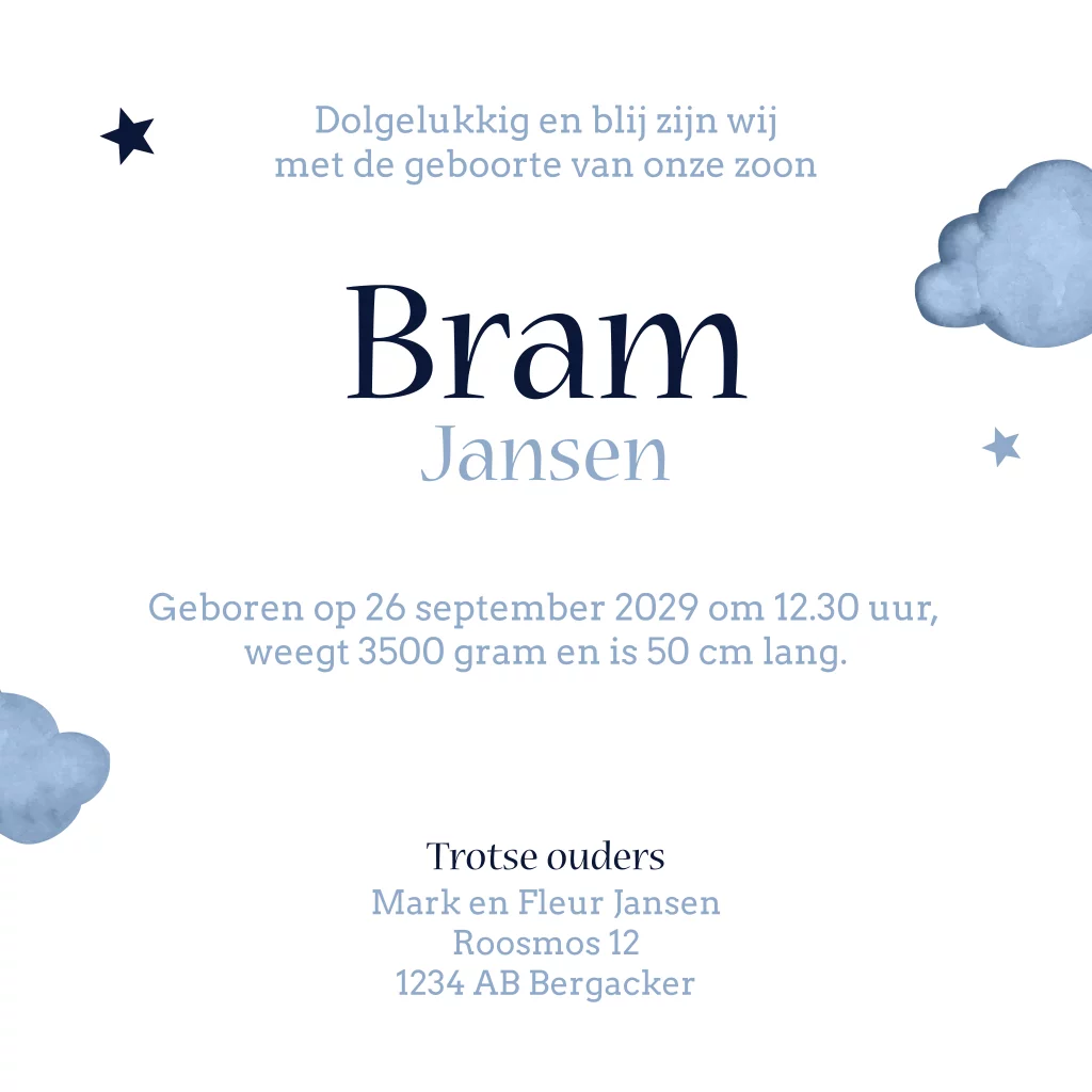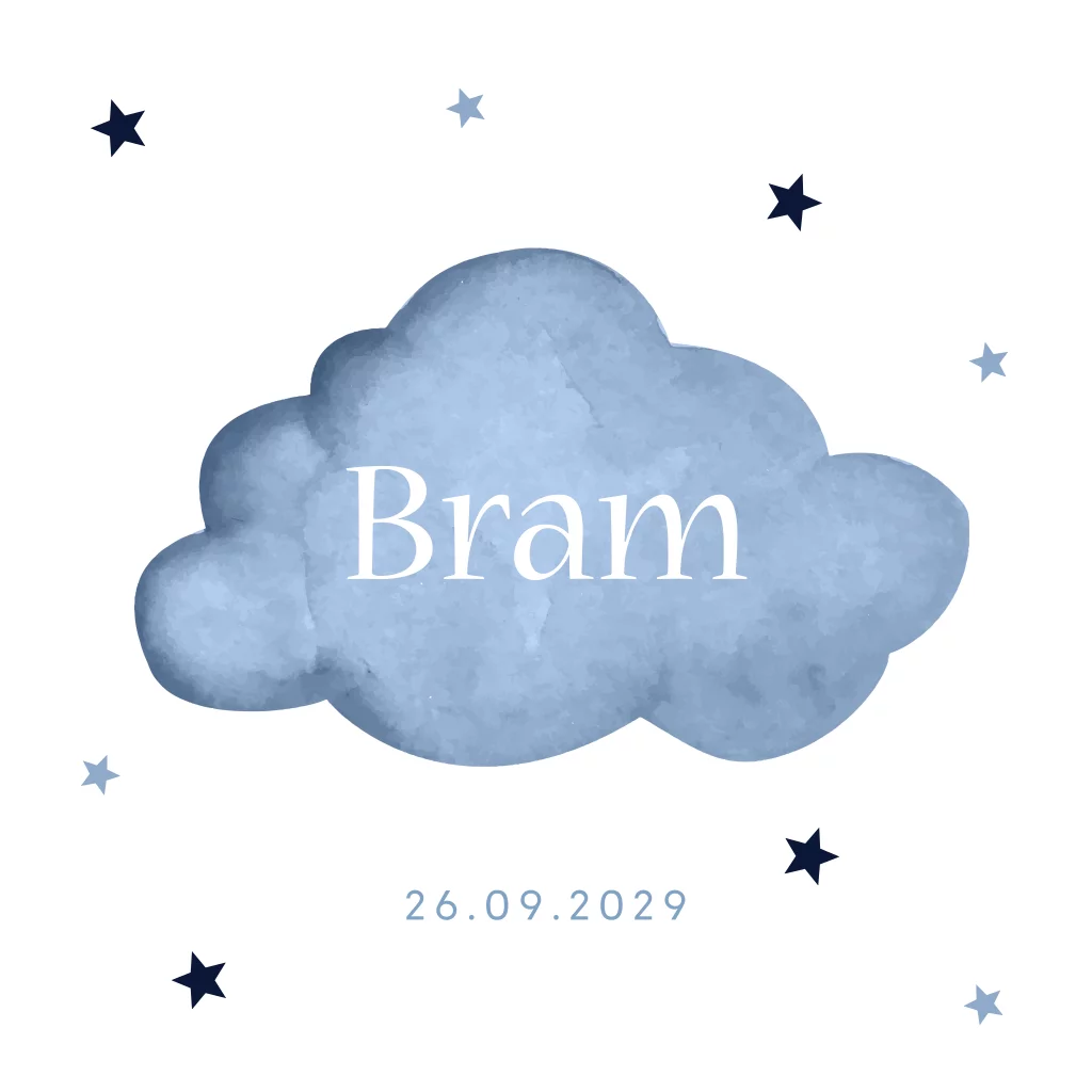 Een lief geboortekaartje met in het midden een waterverf blauwe wolk. In het midden van de wolk staat de naam van de kleine. Om de wolk heen staan blauwe sterren en sterren gedrukt in foliedruk.