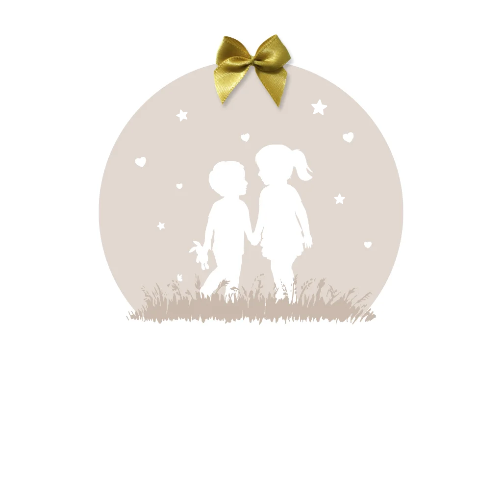 Een schattig lief beige met goud kaartje met kleine jongen en meisje die naar elkaar kijken in het gras, afgebeeld als silhouet. Om de kleintjes heen dwarrelen hartjes en sterren in het rond. Bovenaan de beige cirkel kan je een bijpassend strikje plaatsen om het helemaal compleet te maken. Tijdens het bestellen van de kaart kan je de strikjes er los bij bestellen.