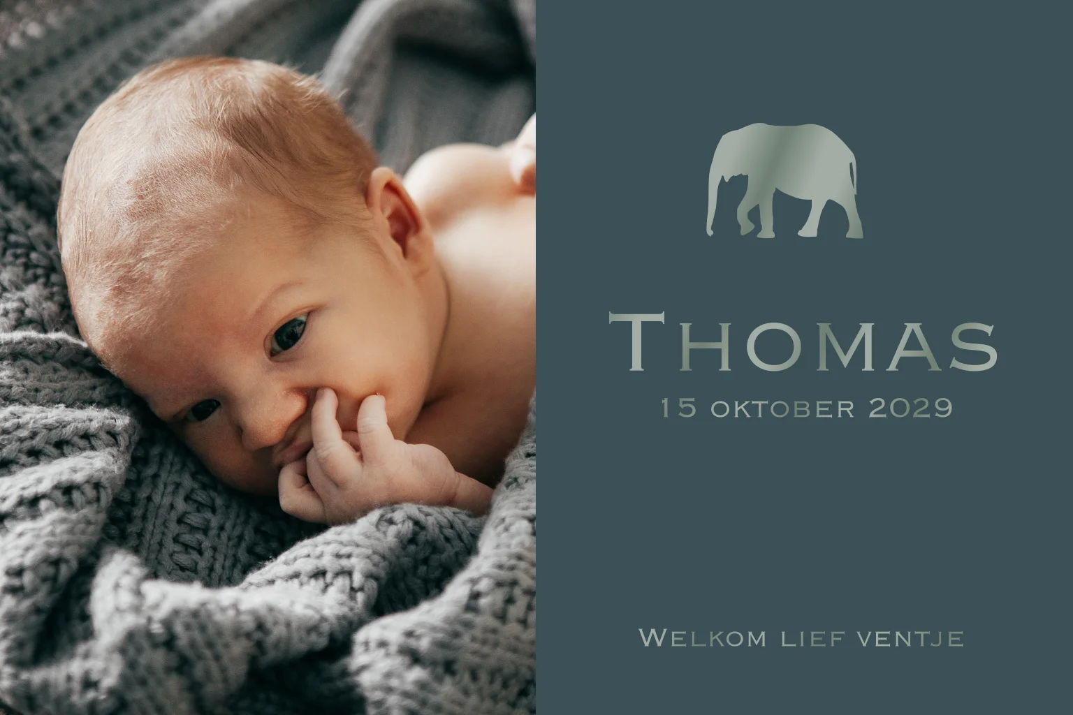 Een hip geboortekaartje met op de voorzijde ruimte voor een eigen foto. Het gekleurde vlak is nog aan te passen naar elke andere kleur in de editor. Boven de naam van de baby is het silhouet van een olifant te zien. Op de voorzijde is ook gebruikt gemaakt van hoogglans foliedruk.