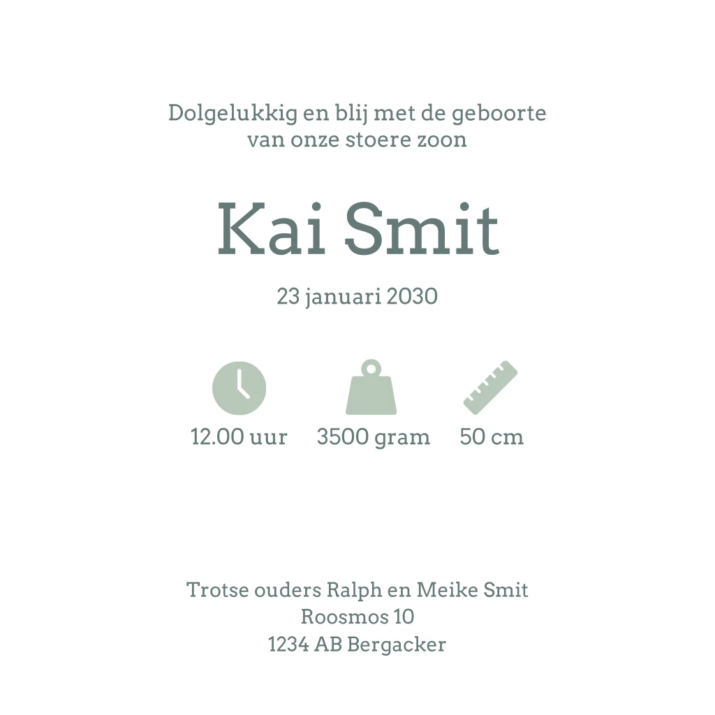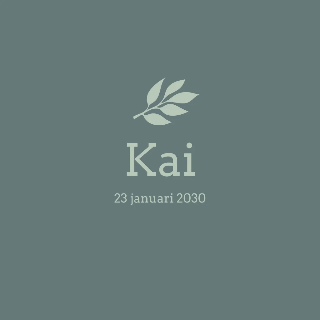 Een strak minimalistisch geboortekaartje met een groene achtergrond. Boven de naam van de kleine staat een kleine takje. Het takje komt aan de binnenzijde van de kaart ook weer terug.