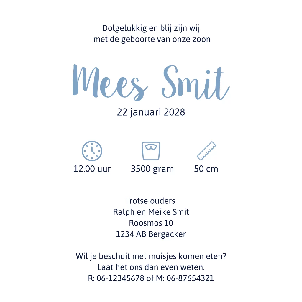 Een strak geboortekaartje met op de voorzijde twee schuine vlakken in de kleuren donkerblauw en grijsblauw. Boven de vlakken staat de naam van de kleine met daarboven een klein sterretje.