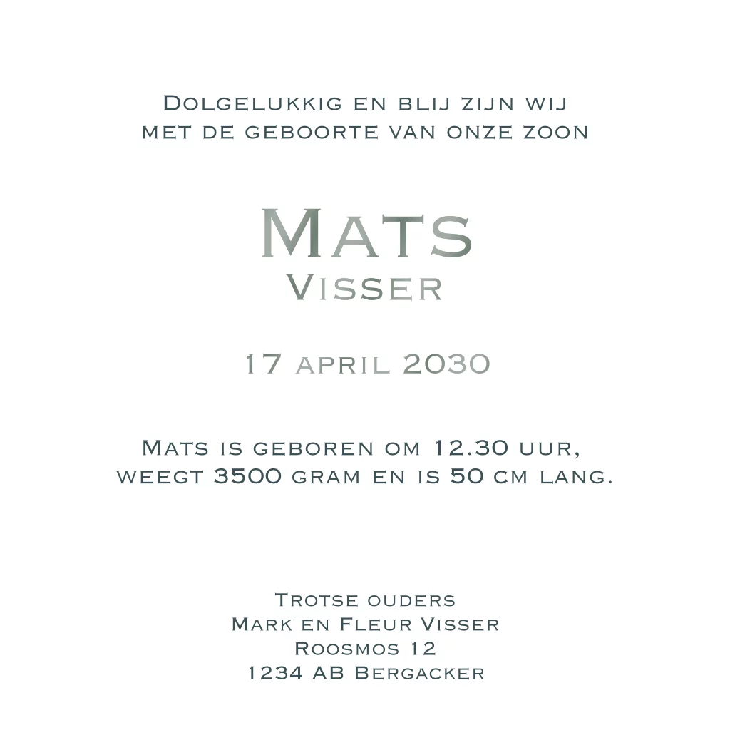 Een mooi strak geboortekaartje met op de voorzijde twee kleine voetjes. Onderaan het geboortekaartje staat de naam van de kleine met daaronder de geboortedatum. De achtergrondkleur is aan te passen in de editor. De voetjes en tekst staan in hoogglans gedrukt wat een mooi luxe gevoel geeft. Deze kleur is ook nog te wijzigen in de editor.