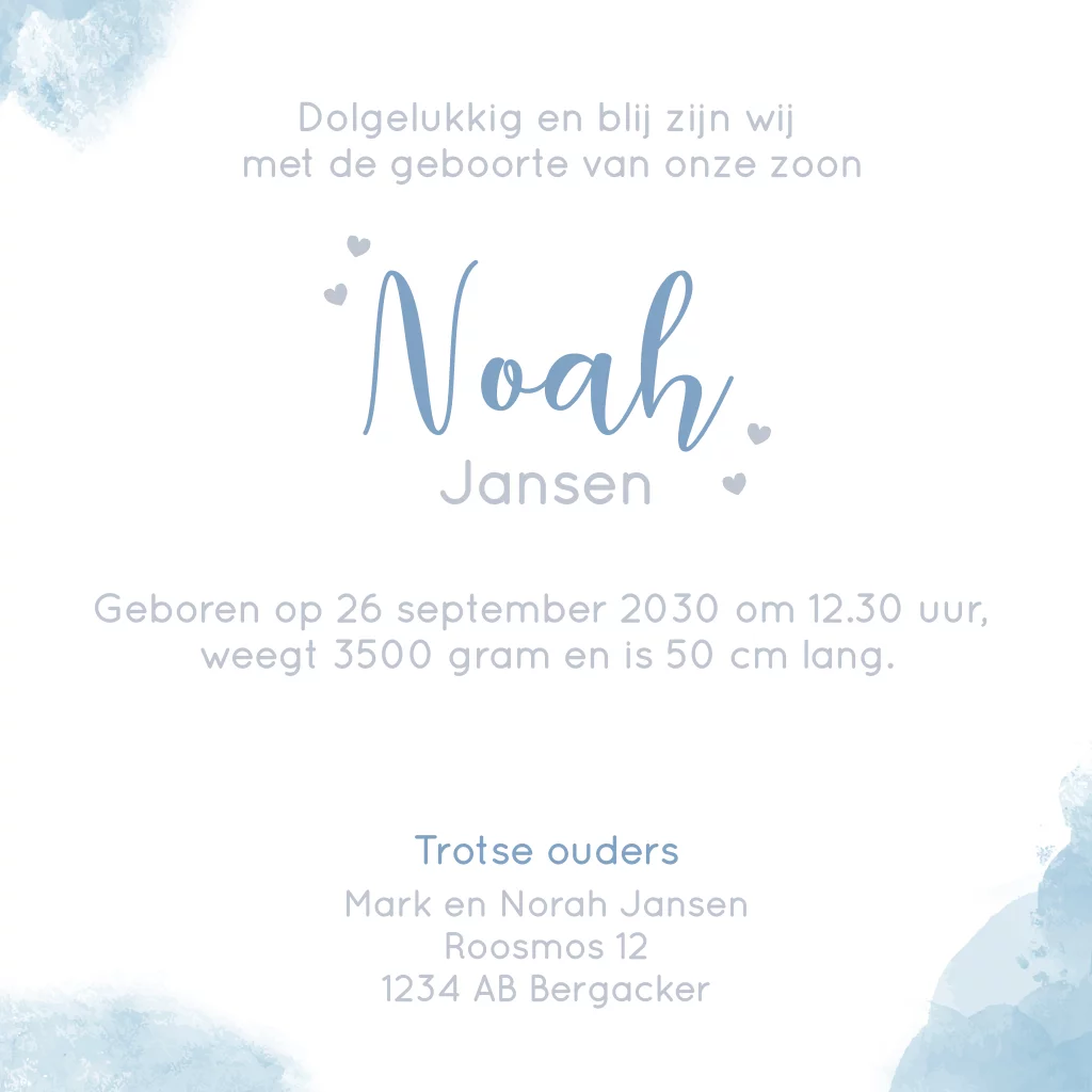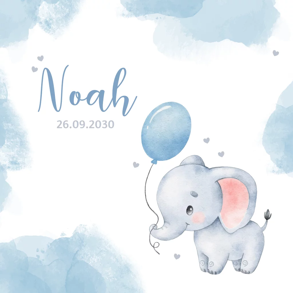 Een schattig olifantje met in zijn slurf een blauwe ballon vast. Aan de randen van de kaart is lichtblauwe waterverf te zien. De waterverf komt ook aan de binnenkant van de kaart weer terug. Naast het olifantje staat de voorbeeldnaam Noah met daaronder de geboortedatum. Pas het kaartje helemaal naar wens aan in de editor.