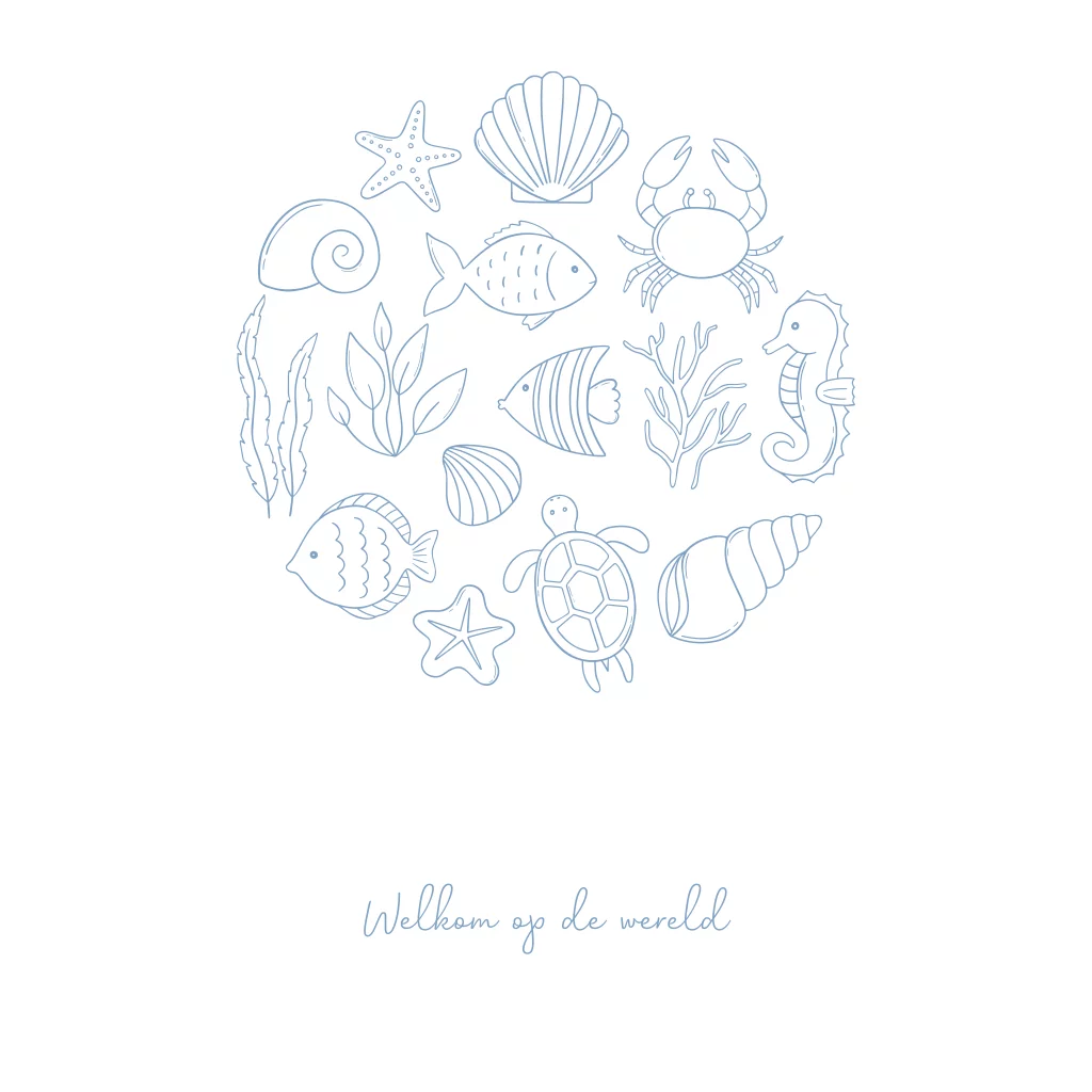 Witte kaart met blauw binnenkant. Op de voorkant staan vissen, schelpen, waterplanten en belletjes in de vorm van een rondje in de kleur blauw en zilverfolie.
