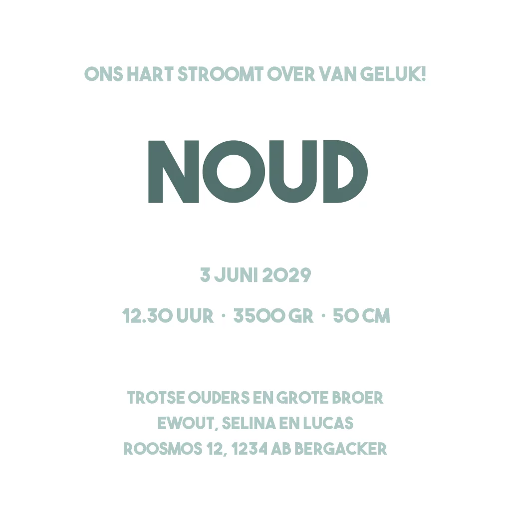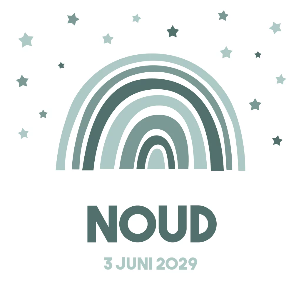 Speels geboortekaartje met een regenboog omringd door sterren in drie verschillende tinten groen. Een vrolijke kaart voor de geboorte van een zoon.