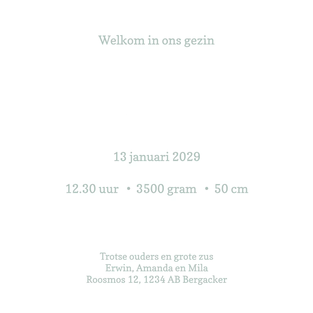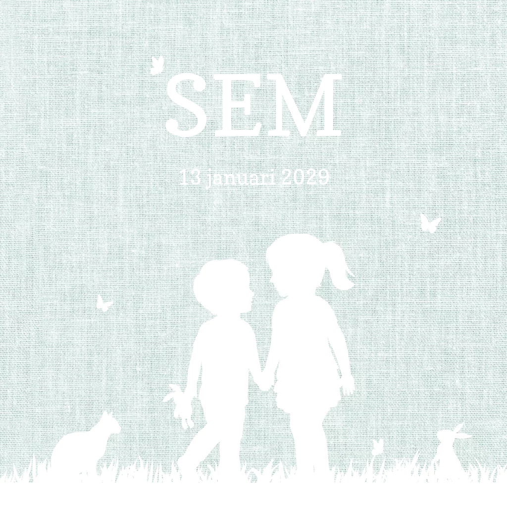 Een lief geboortekaartje met een groen linnen structuur achtergrond waar in het wit een silhouet van twee kinderen, konijntjes, een hond en kat zijn afgebeeld. In de lucht zijn vliegende vlinders afgebeeld in goudfolie net als de naam op de voorkant. Aan de binnenkant van de kaart zie je hetzelfde silhouet van de kindjes en zijn de naam en het gedichtje in goudfolie gedrukt.