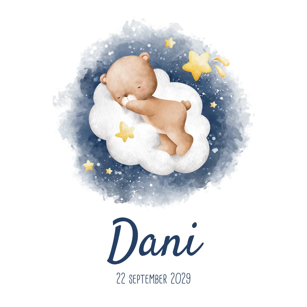Lief kaartje in waterverf stijl met een teddy beer slapend op een wolkje omringd door sterren.