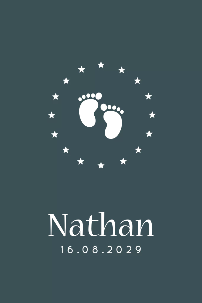 Een geboortekaartje met een stijlvol en liefdevol ontwerp. Met de naam en voetjes in foliedruk en een groen/blauwe achtergrond straalt dit kaartje luxe uit. De sterretjes geven het geboortekaartje een speelse en lieve uitstraling, perfect voor de aankondiging van jullie zoontje.