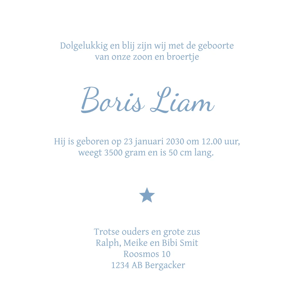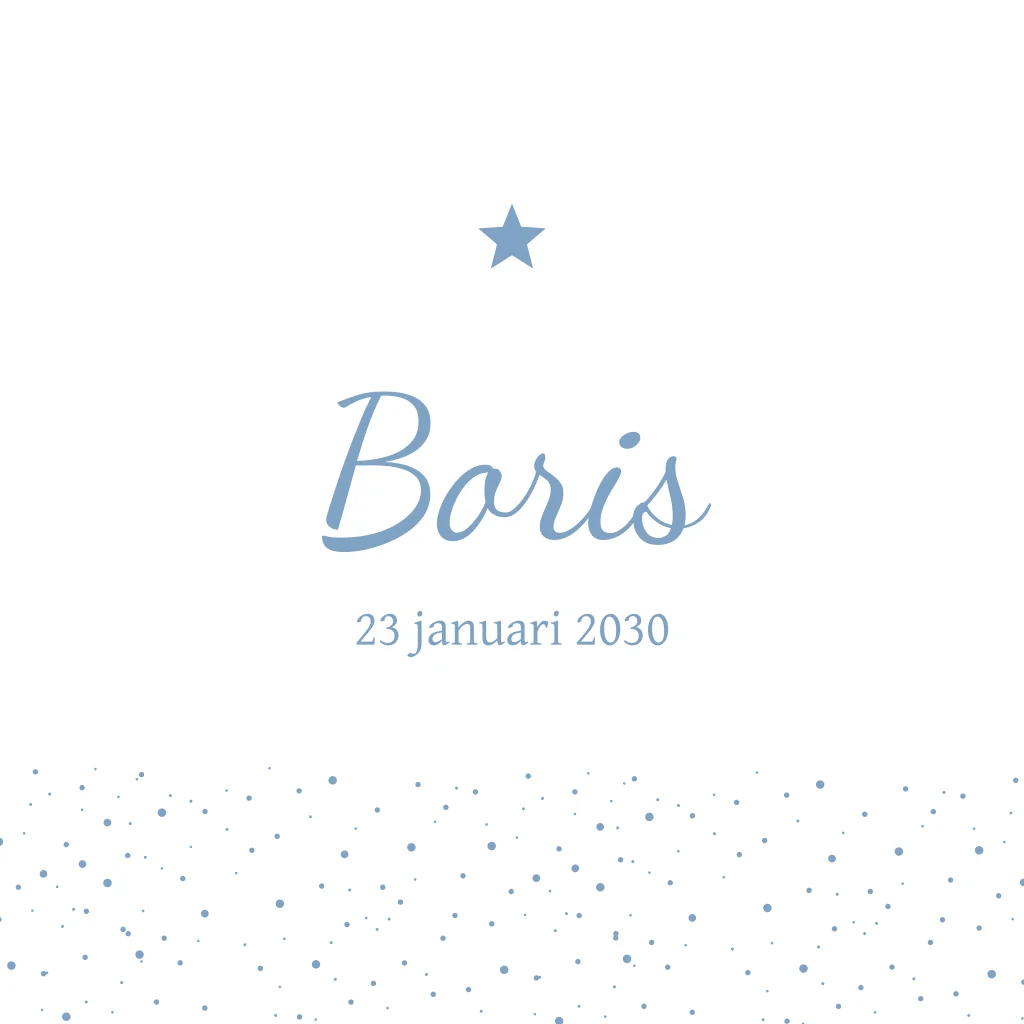 Een lief klassiek wit geboortekaartje voor de geboorte van een jongen. Op de voorzijde is aan de onderzijde van de kaart een rand van blauwe stippen te zien. Boven de stippen staat de naam en geboortedatum met daarboven een klein hartje. De kleur blauw is in de editor te wijzigen naar elke andere kleur.