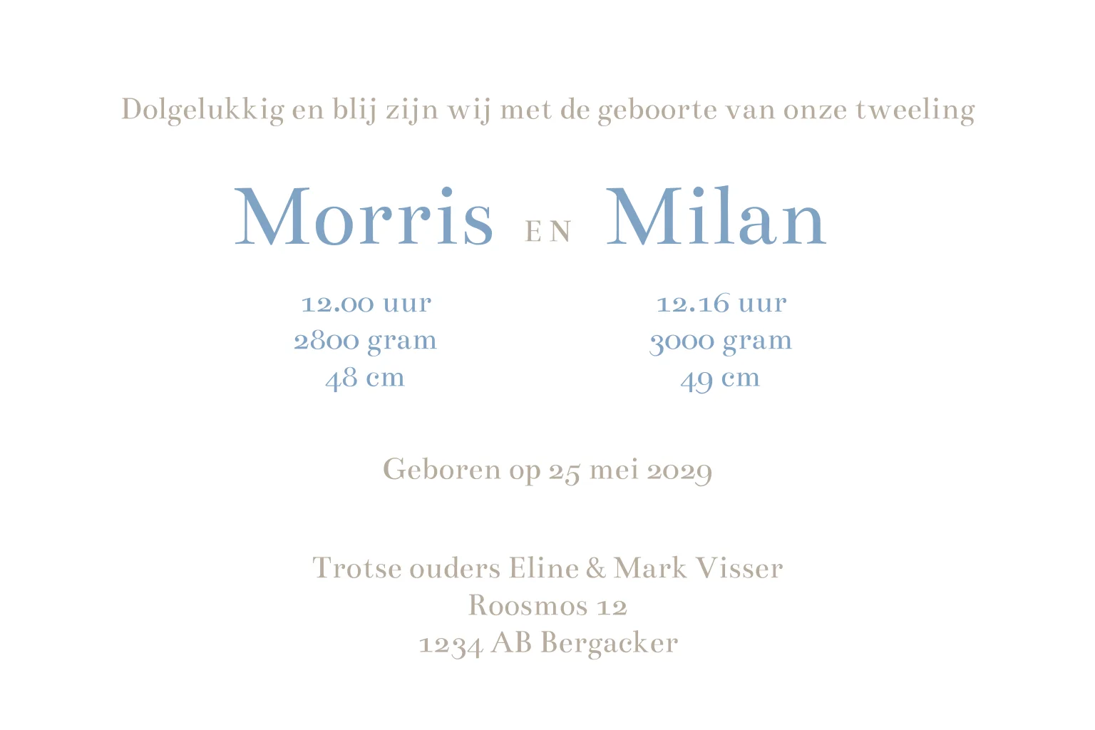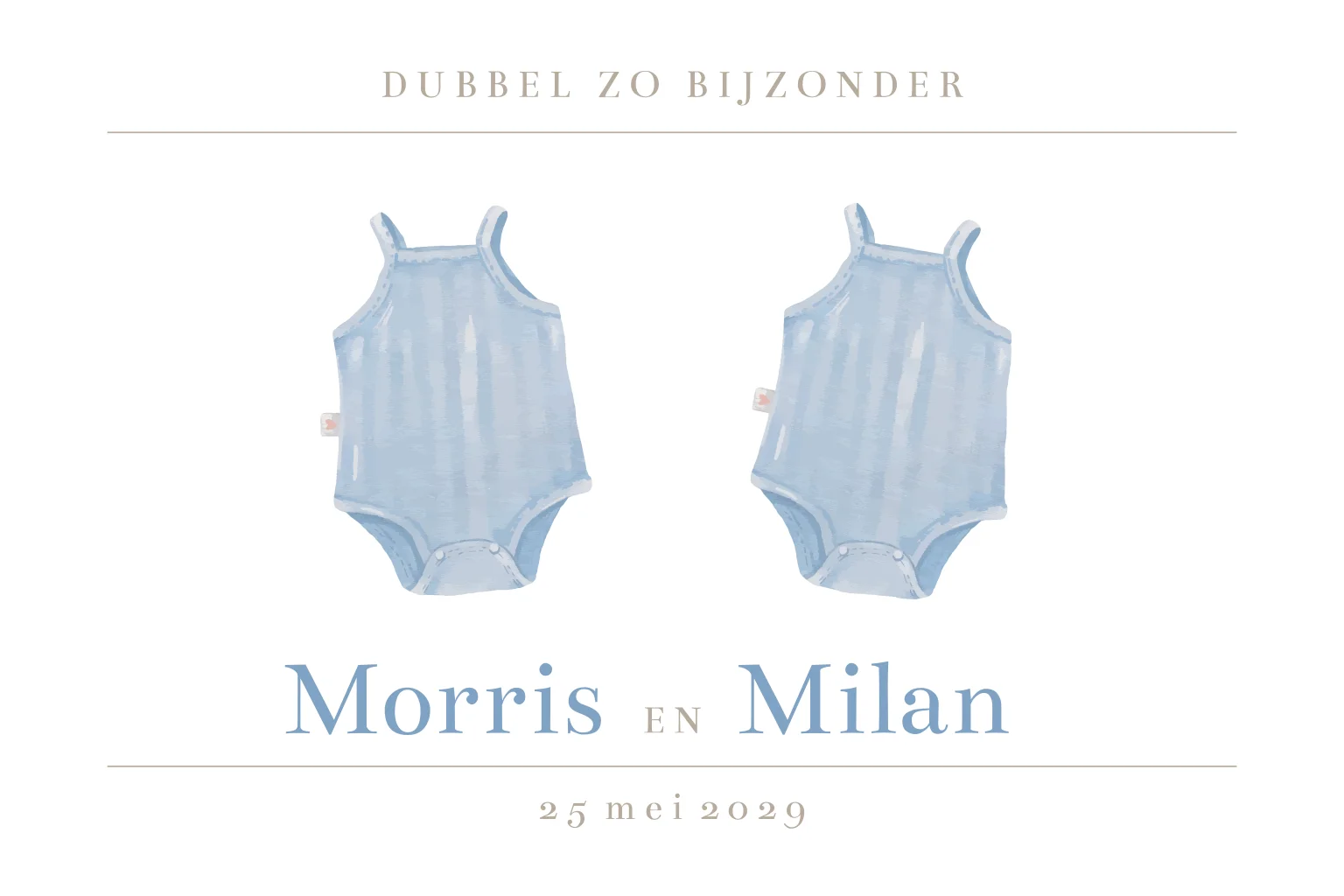 Een lief en klassiek geboortekaartje voor de geboorte van een tweeling. Op de voorzijde staan twee lichtblauwe rompertjes. Een mooi geboortekaartje voor de geboorte van twee lieve kleine jongens.