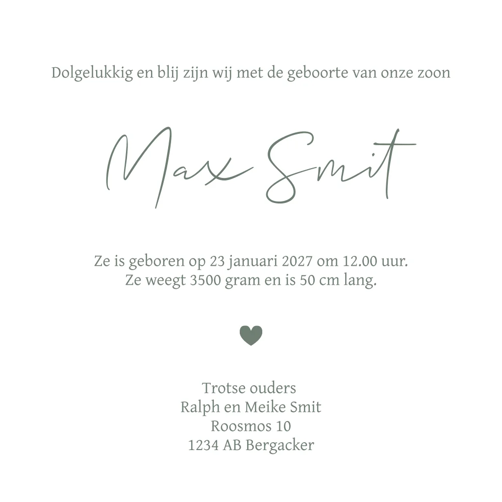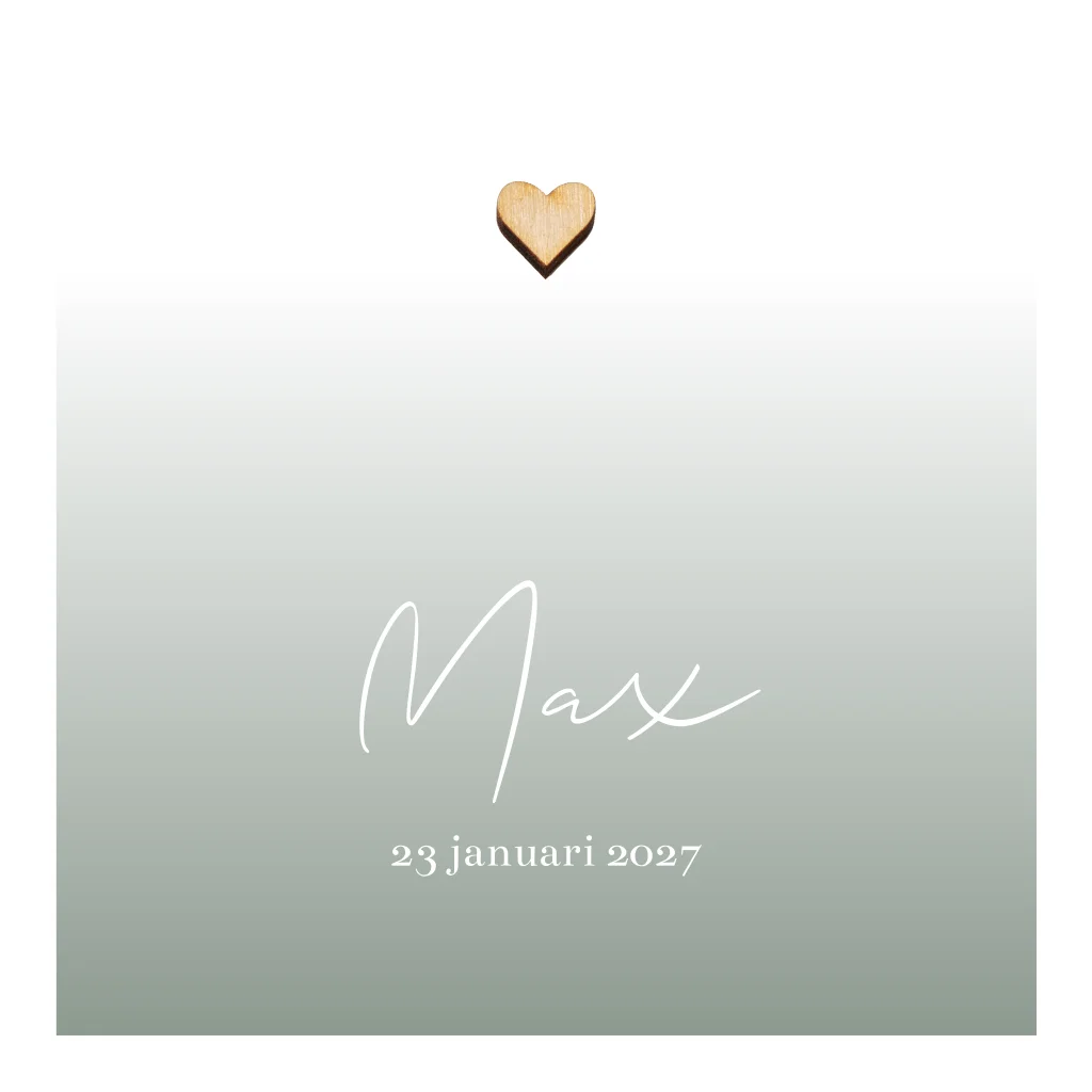 Een hip geboortekaartje met op de voorzijde een verloop in de kleur groen. Boven de naam van de baby is ruimte om een hout figuurtje te plakken zoals een hartje. Dit maakt het kaartje extra leuk. De houten figuurtjes zijn apart erbij te bestellen. De kleur groen is in de editor ook nog te wijzigen naar elke andere kleur.