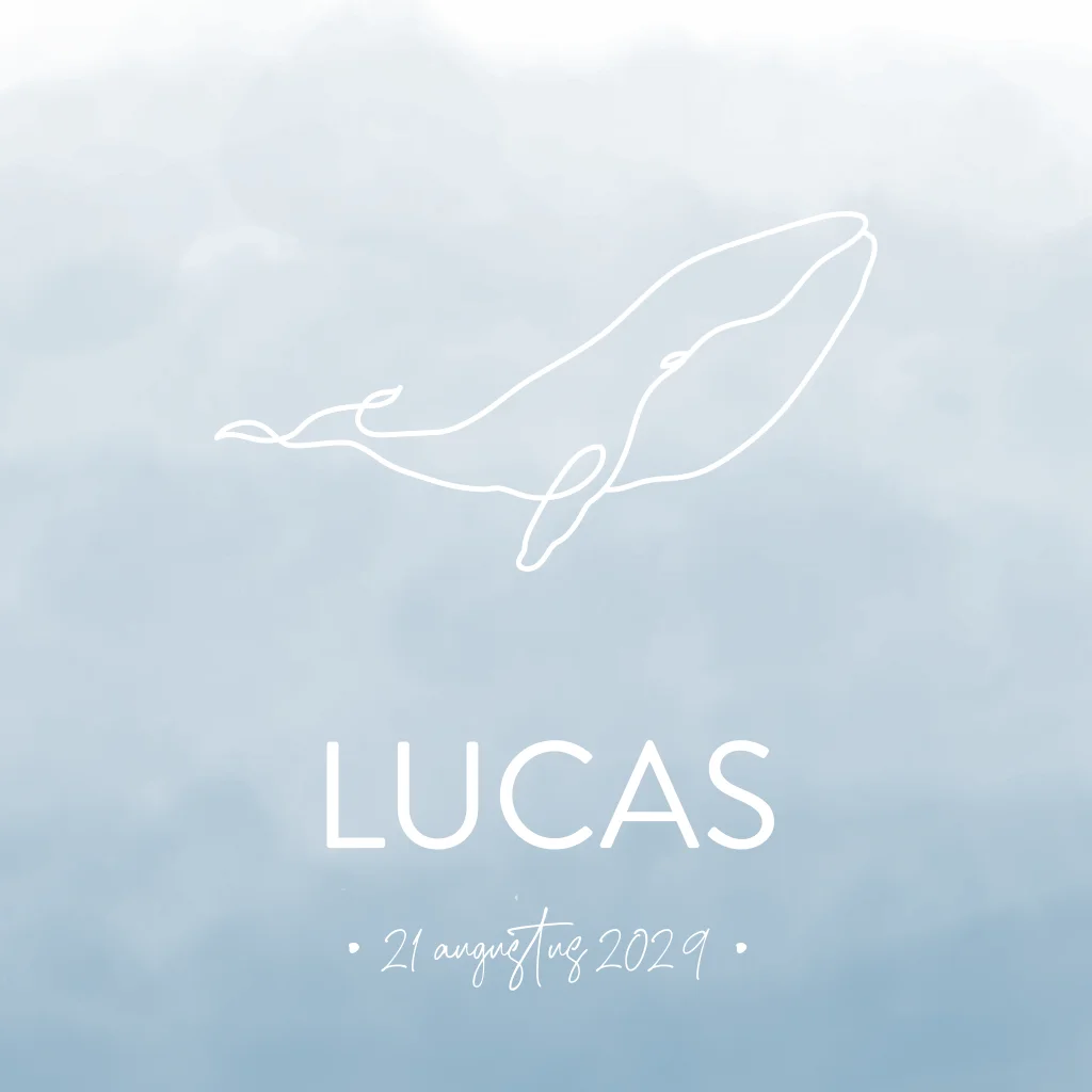 Blauw gekleurde waterverf kaart met een lijntekening van een walvis in de kleur wit op de voorkant.