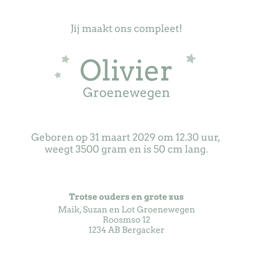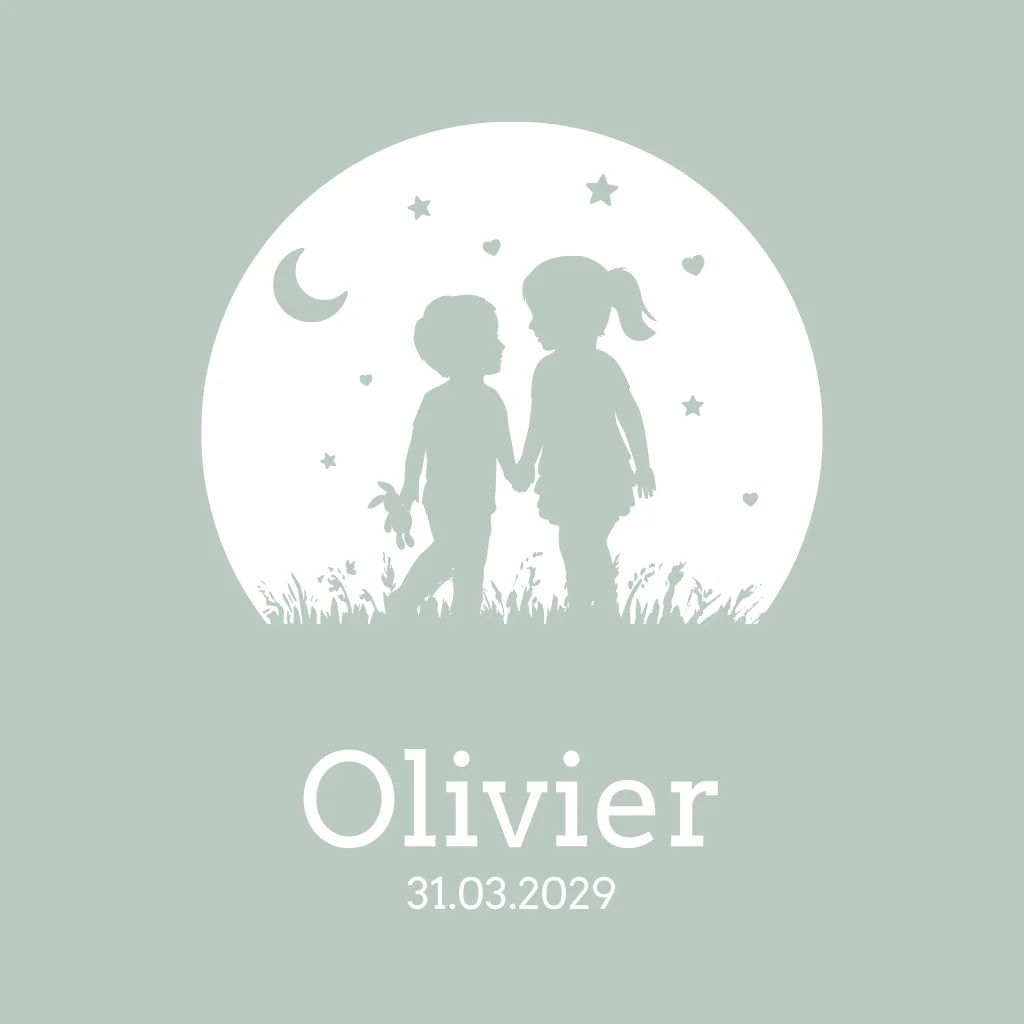 Een lieflijk silhouet kaartje van een jongen en een meisje, perfect voor ouders die op zoek zijn naar een combinatie van tederheid en stijl. De zachte groen gekleurde achtergrond vormt een mooi contrast met de schattige afbeelding van een zus en broer, omringd door sterren en de maan. Dit kaartje is ideaal voor gezinnen die hun tweede kindje verwachten! Het gedichtje en de naam van jullie kindje aan de binnenkant worden omringd door dezelfde sterren en maan die de voorkant van het kaartje sieren, waardoor er een prachtig geheel ontstaat.