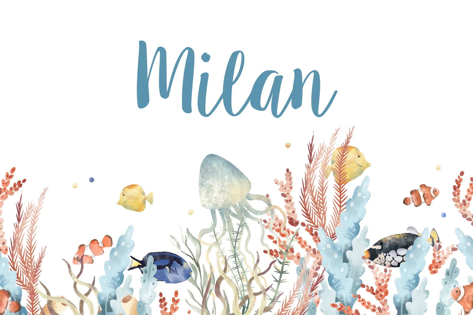 Vrolijk gekleurde kaart met vissen, waterplanten en koraal in waterverf stijl. De binnenkant van de kaart is deels blauw.