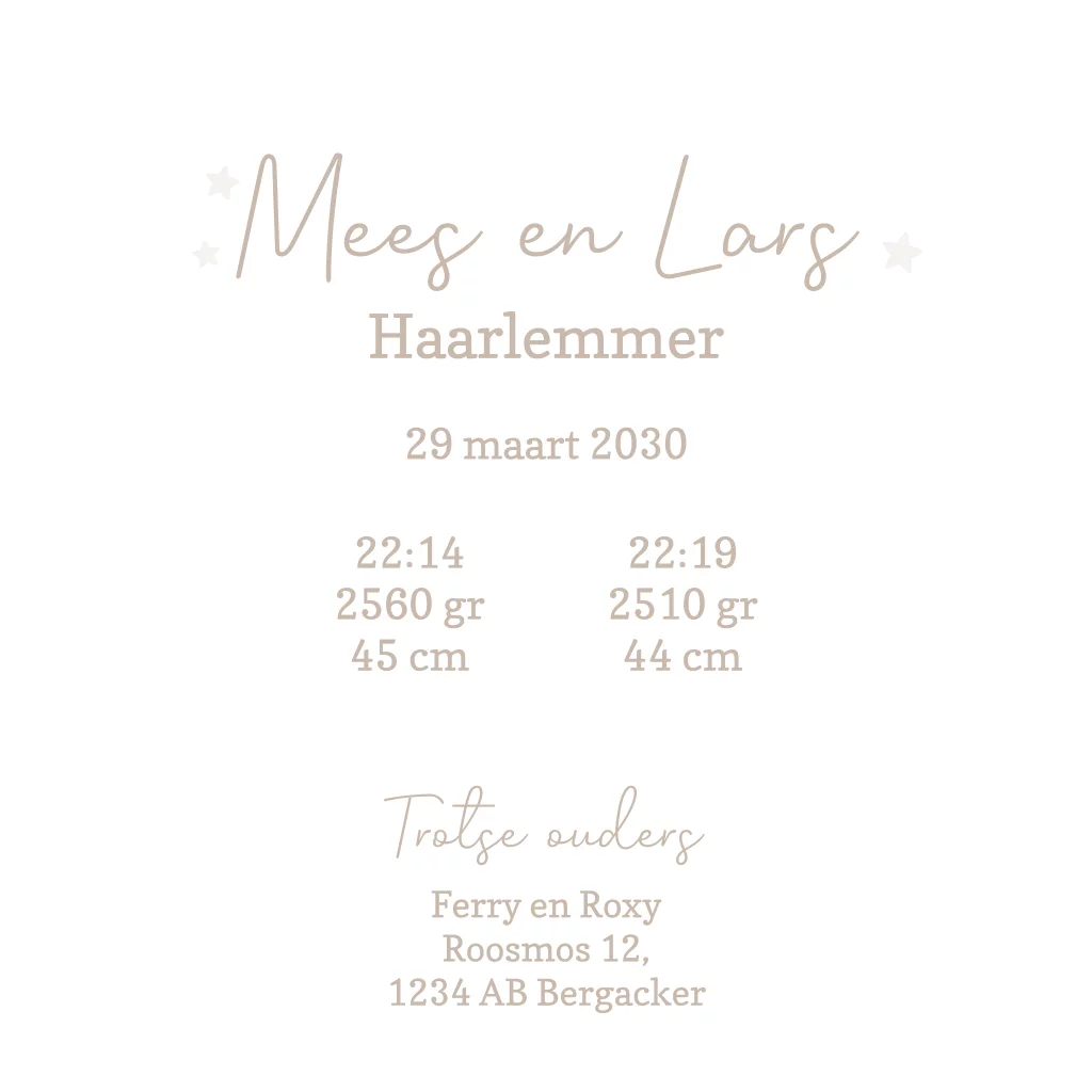 Op dit witte geboortekaartje staan een tweeling afgebeeld in het wit met twee knuffeltjes in de hand tussen de sterren, hartjes, vlinder en maan in een beige gekleurde cirkel.