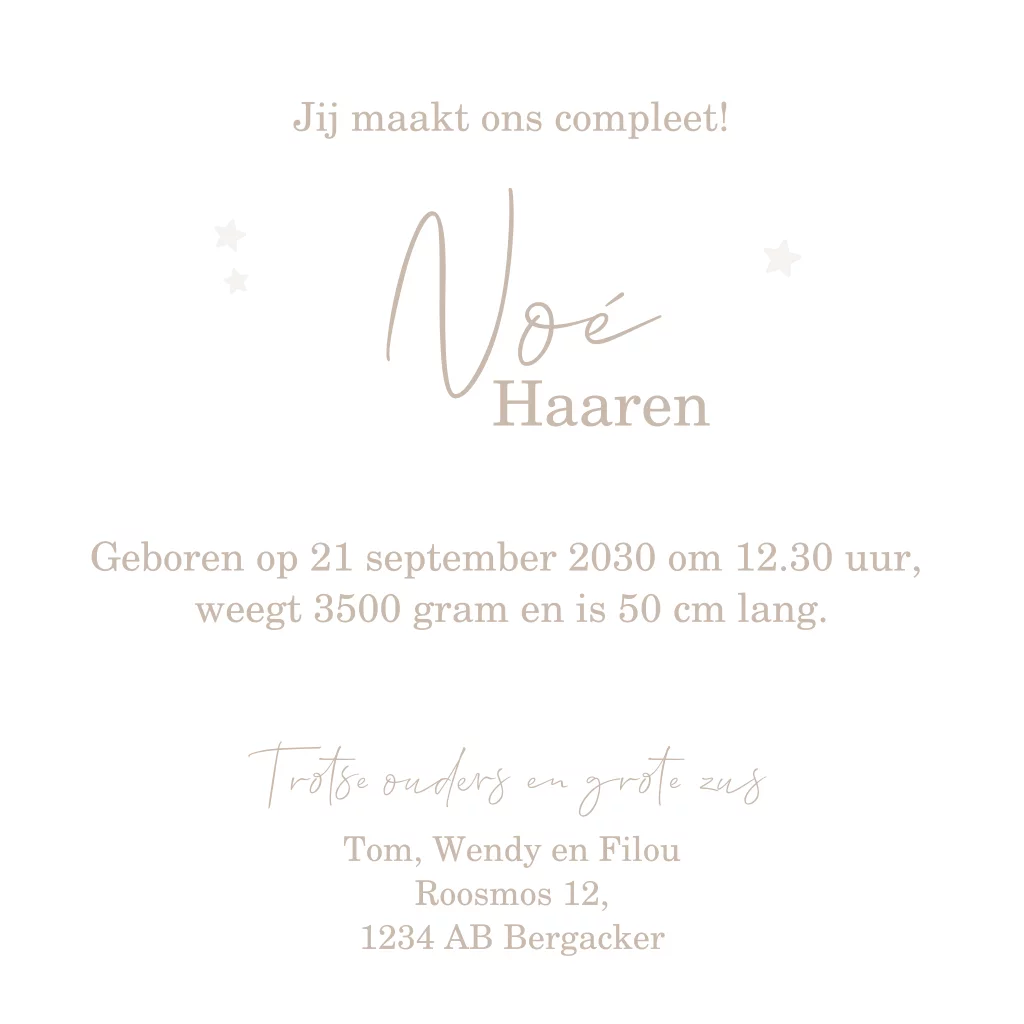 Op dit zacht gekleurde beige kaartje staan twee kindjes afgebeeld in het gras tussen de sterren, hartjes, vlinder en de maan. De kaart is beschikbaar in alle samenstellingen voor een tweede kindje.