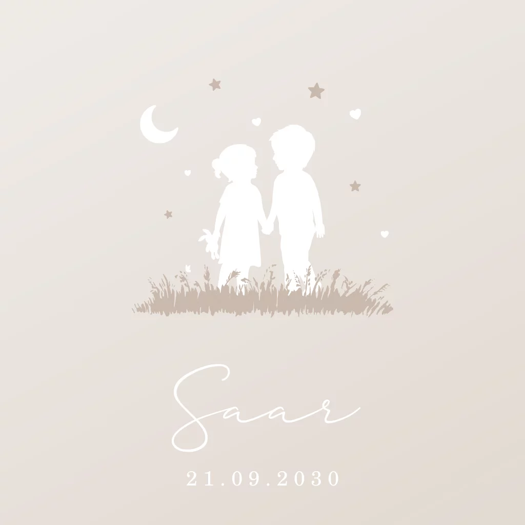 Op dit zacht gekleurde beige kaartje staan twee kindjes afgebeeld in het gras tussen de sterren, hartjes, vlinder en de maan. De kaart is beschikbaar in alle samenstellingen voor een tweede kindje.
