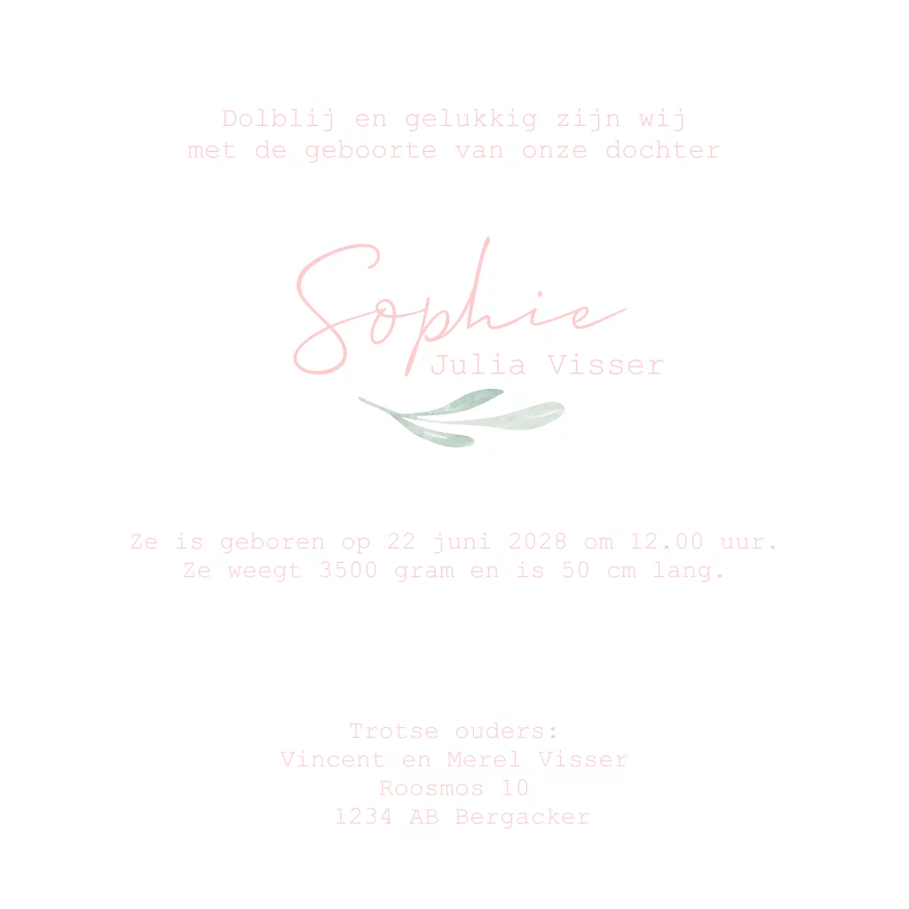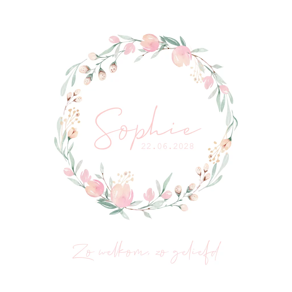 Een lief geboortekaartje met op de voorzijde een bloemenkrans met daarin de naam van de baby. In de krans zitten lieve kleine roze bloemetjes.