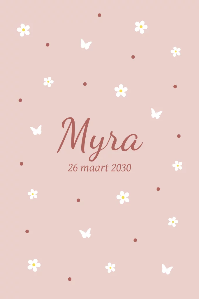 Een erg lief geboortekaartje voor een klein meisje. Kleine bloemetjes en kleine vlindertjes staan verspreid over het kaartje. In het midden staat de voorbeeldnaam Myra met daaronder de geboortedatum. De achtergrondkleur is roze maar kan in de editor ook nog aangepast worden naar een andere kleur.