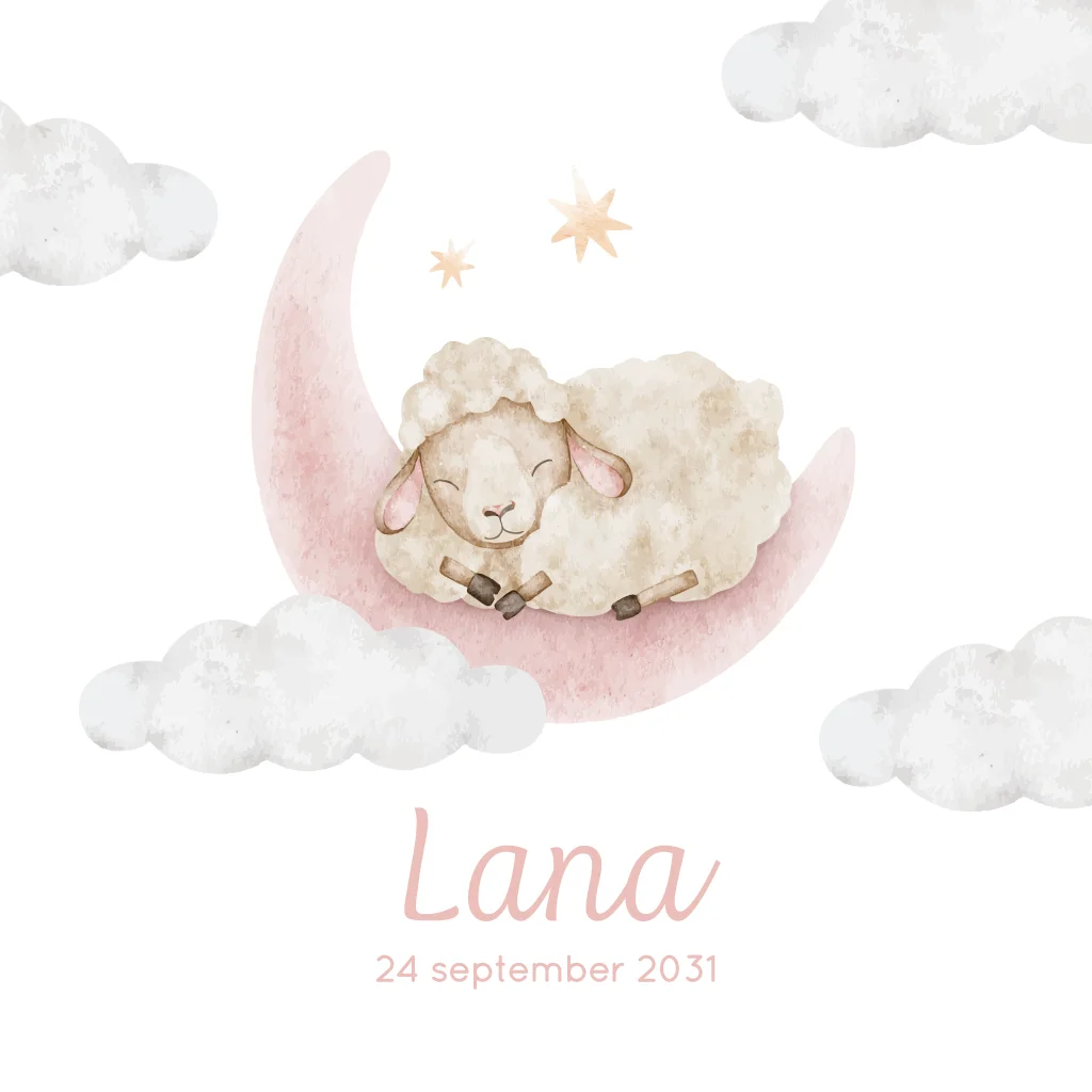 Geboortekaartje lammetje op roze waterverf maan