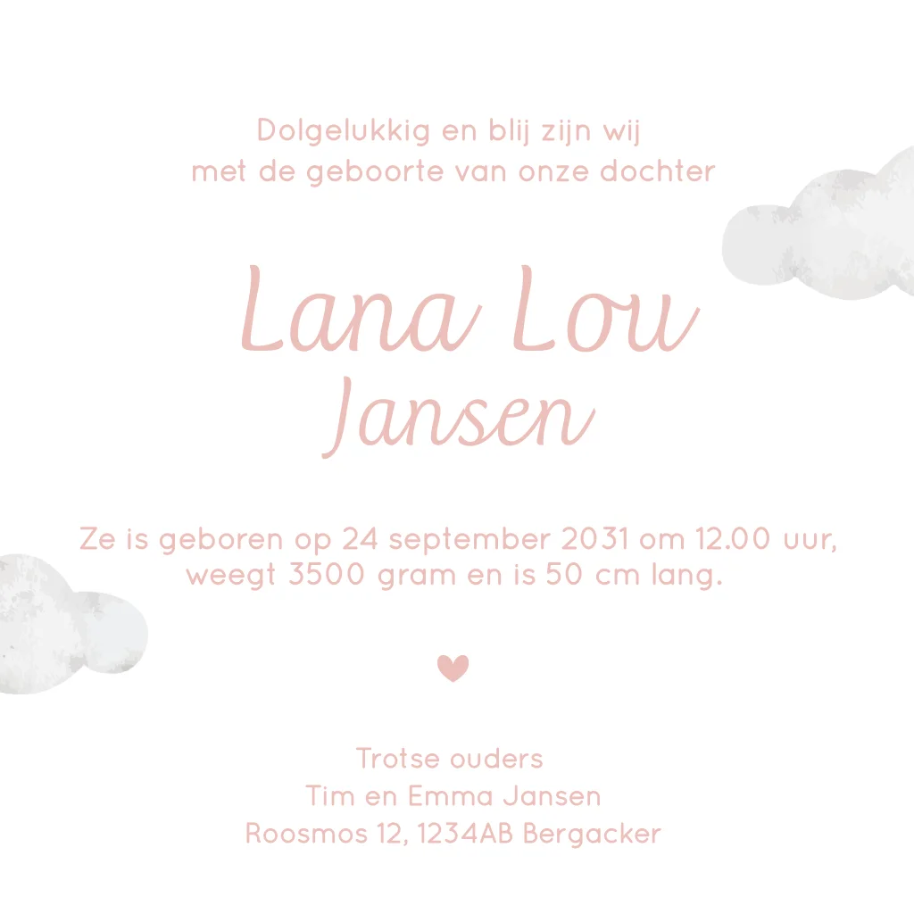 Een lief slapend lammetje op een roze waterverf maan. De maan is tussen de wolken afgebeeld. Een lief dromerig geboortekaartje voor de geboorte van een meisje. Onder de roze maan staat de naam van de baby en de geboortedatum. Aan de binnenkant komen de wolkjes ook weer terug.