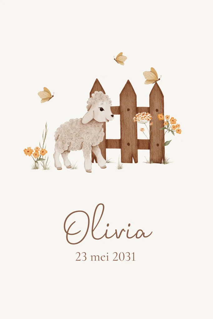 Dit geboortekaartje met schaapje en houten hekje heeft een warme, landelijke uitstraling. Het lieve lammetje, de vlinders en de subtiele bloemetjes zorgen voor een zacht en rustig geheel. De natuurlijke tinten en aquarelillustratie maken dit kaartje tijdloos en sfeervol.