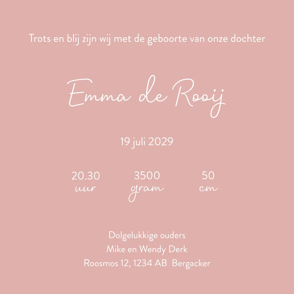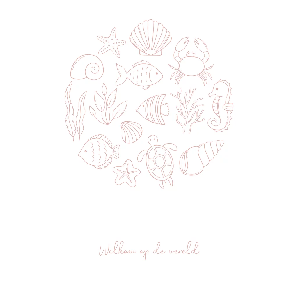 Witte kaart met roze binnenkant. Op de voorkant staan vissen, schelpen, waterplanten en belletjes in de vorm van een rondje in de kleur roze en zilverfolie.