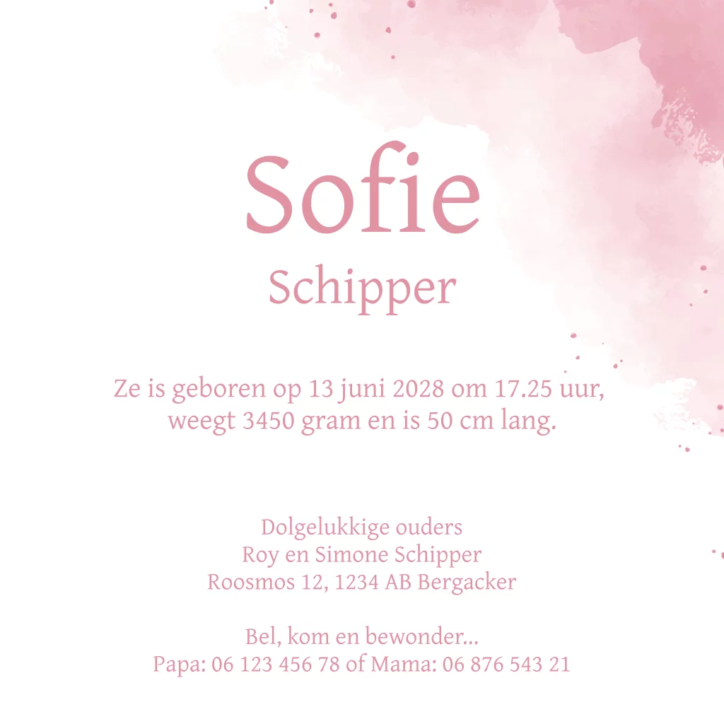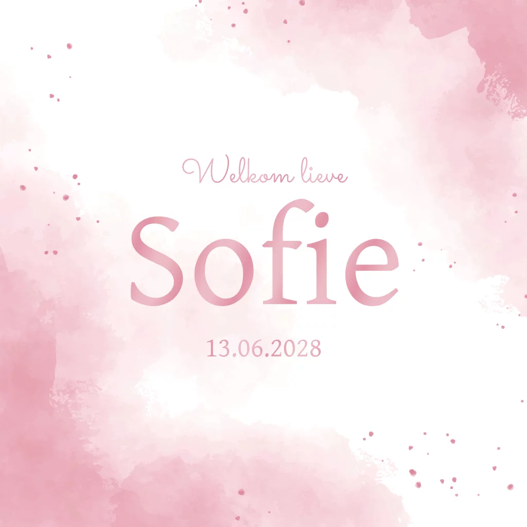 Vierkante kaart met roze waterverf vlekken en spetters verdeeld over de kaart.
