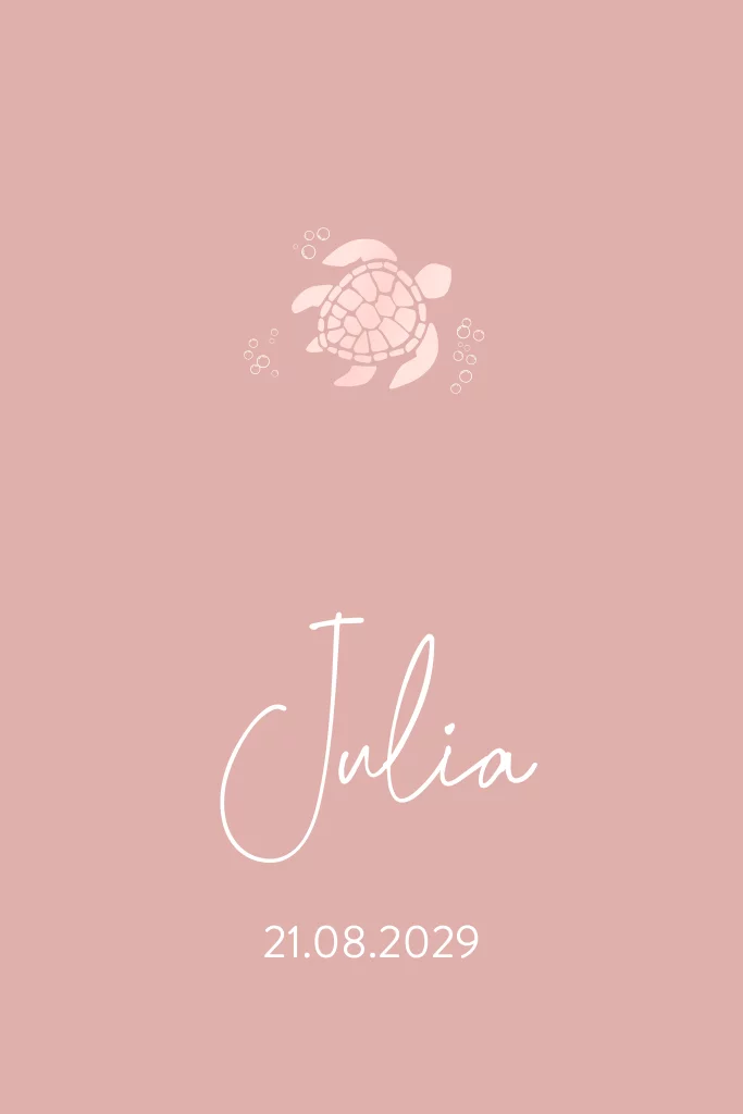 Enkel roze geboortekaartje met ronde hoeken en op de voorkant een klein schildpadje in roze hoogglans kleur met kleine belletjes er omheen.