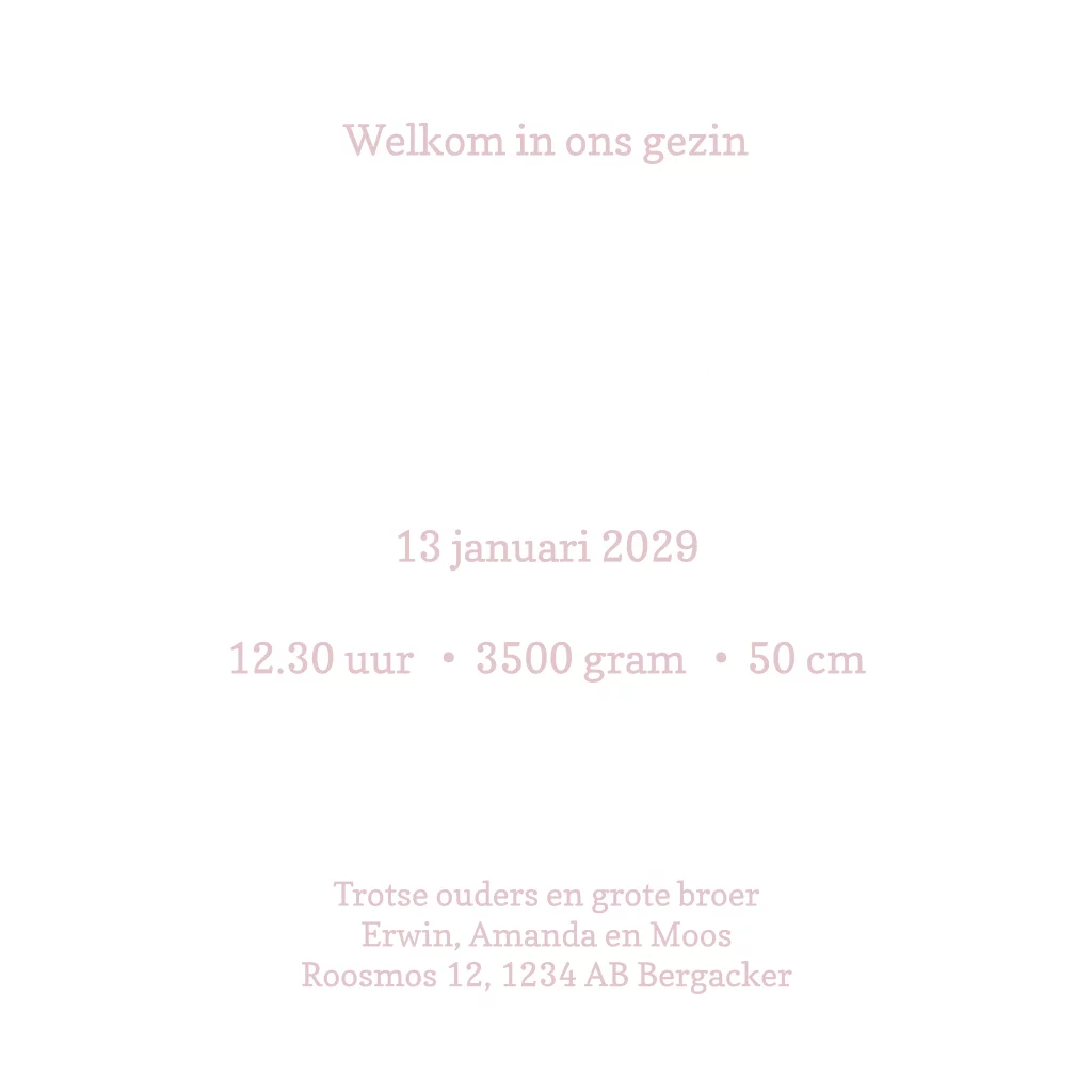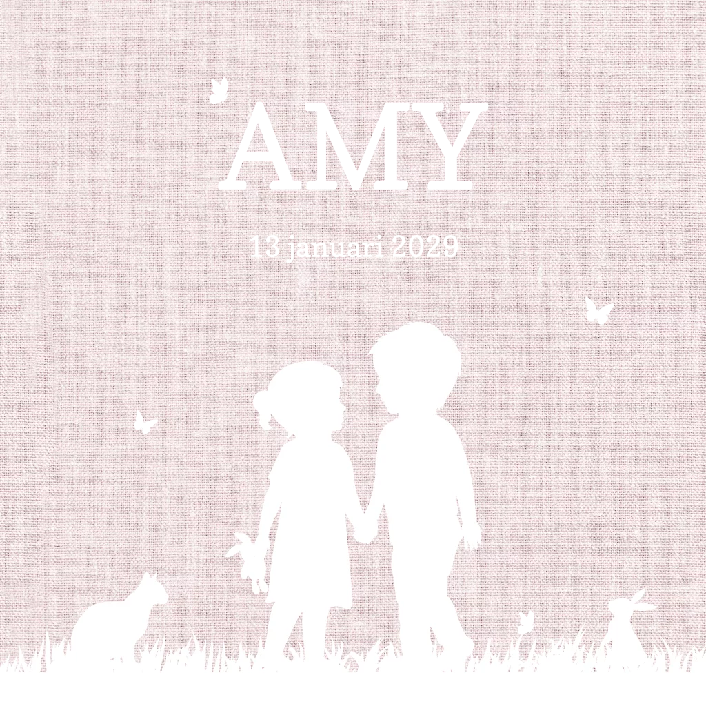 Een lief geboortekaartje met een roze linnen structuur achtergrond waar in het wit een silhouet van twee kinderen, konijntjes, een hond en kat zijn afgebeeld. In de lucht zijn vliegende vlinders afgebeeld in goudfolie net als de naam op de voorkant. Aan de binnenkant van de kaart zie je hetzelfde silhouet van de kindjes en zijn de naam en het gedichtje in goudfolie gedrukt.