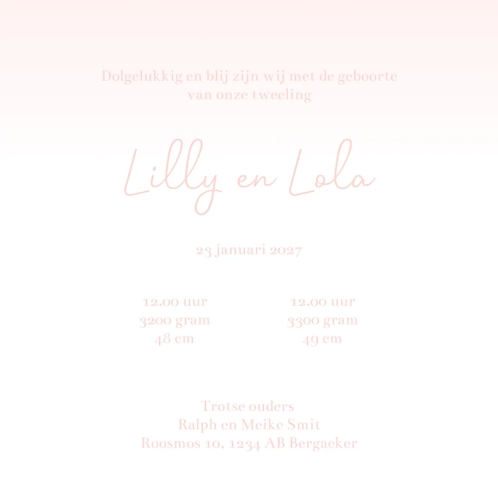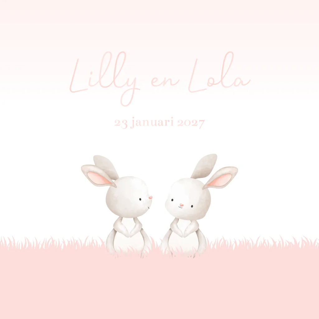 Een lief geboortekaartje voor een tweeling. Op de voorzijde staan twee kleine konijntjes in het gras. Boven de konijntjes is er ruimte voor de namen en de geboortedatum. De namen en geboortedatum zijn op de voorzijde in hoogglans gedrukt. Dit is ook nog te wijzigen in de editor.